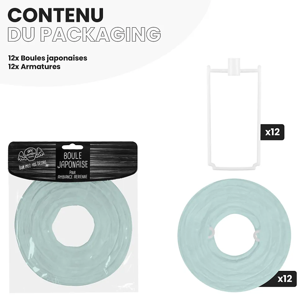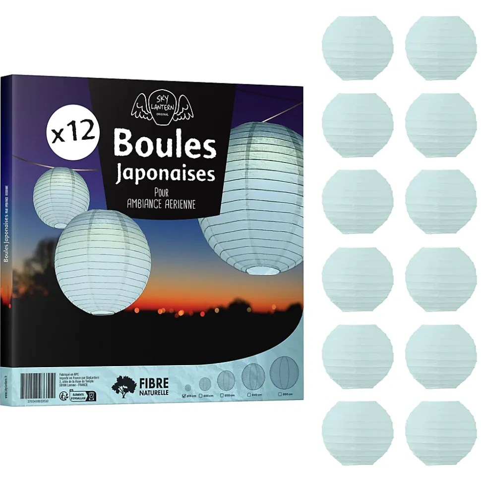 Lot de 12 lanternes japonaises en papier 10 cm – Couleur aquamarineApportez une touche poétique à vos événements grâce à ces lanternes en papier de soie signées SkyLantern. Ce lot de 12 boules décoratives aquamarine de 10 cm de diamètre permet de créer en un clin d’œil une ambiance élégante et festive pour tous types de célébrations : mariage, anniversaire, baptême, garden party ou cérémonie.Faciles à déplier, ces lanternes ne nécessitent aucun outil pour le montage. Suspendez-les à l’aide d’un fil de pêche, d’une cordelette ou d’un filin tendu pour un effet aérien. Leur petite taille les rend idéales pour agrémenter des hauteurs ou compléter une composition plus large avec d’autres tailles de boules en papier, disponibles de 10 à 50 cm.Jouez sur les volumes et les couleurs pour une déco personnalisée, tendance et harmonieuse. Associez-les à des rosaces, pompons, lampions LED ou étoiles pour sublimer vos lieux de réception, que ce soit en intérieur ou en extérieur.Besoin d’idées ? Inspirez-vous de nos guides déco pour apprendre à marier boules, lampions et guirlandes, ou pour créer une allée de cérémonie pleine de charme. SkyLantern, marque française basée à Lille, est reconnue par les pros de la déco pour la qualité et l’élégance de ses produits festifs.