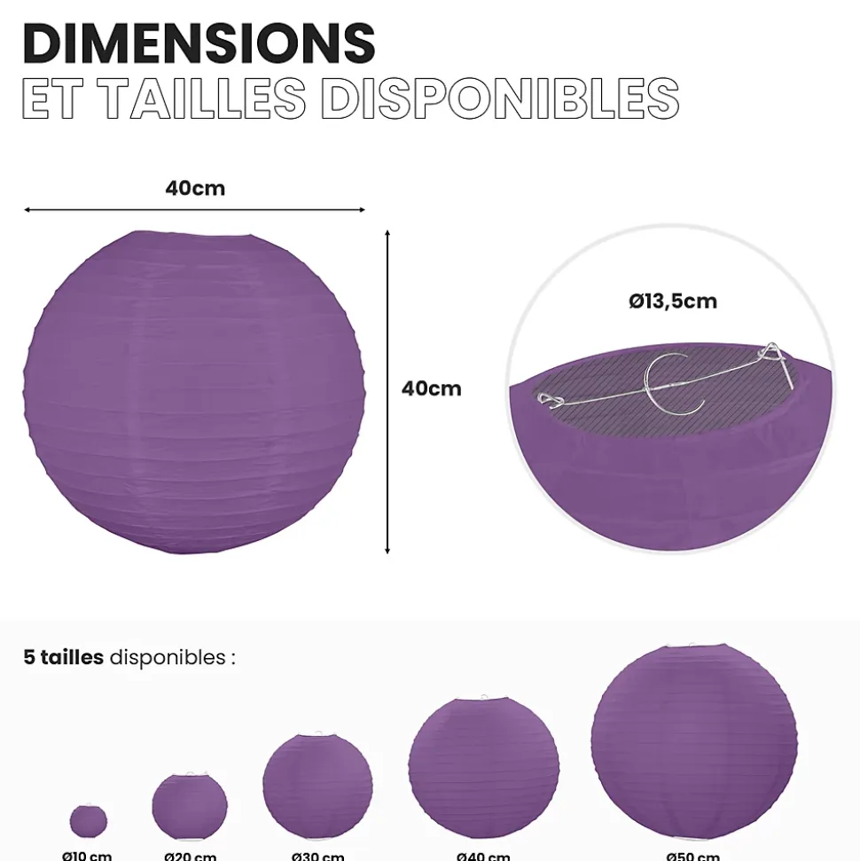 Lot de 12 lanterne papier de 40cm : Une décoration poétique pour tous vos évènementsFini de chercher d’autres idées pour embellir votre lieu de fête, les lanternes chinoises en papier de soie de SkyLantern.fr, vont vous permettre de créer un cadre poétique et authentique en quelques minutes. Epatez vos invités en utilisant votre sens du détail, puis composez en suivant vos idées. Votre lot de 12 boules papier aubergine de 40 cm devrait vous surprendre grâce à l’éclat de ses teintes sans oublier sa jolie forme qui s’intègre dans tout lieu festif.Lanterne japonaise pour déco mariage aubergine 40 cm : comment l’utiliser ?Ce type de boule chinoise est pratique pour les mariages, une Bar Mitzvah, une decoration anniversaire. Nos boules papier sont simples à déplier, il ne vous faudra pas longtemps pour décorer votre salle de couleur aubergine. Le montage ne réclame pas d’outil compliqué. Pour un meilleur rendu, vous pouvez suspendre la suspension luminaire avec du fil de pêche ou de la cordelette. N’hésitez pas à faire passer un filin parcourant les hauteurs. Ces articles se marient bien avec les autres produits SkyLantern, les lampions LED, les étoiles, ou les rosaces.Si jamais la couleur aubergine n’est pas la couleur dominante dans votre thème, vous pouvez compléter avec l'n;une des nombreuses teintes disponibles. Mixez différentes tailles en plus du diamètre 40 cm, modèles vendus: de 10 à 50 cm.SkyLantern est une marque française basée à Lille et spécialisée dans la deco japonaise à base de lampion papier. La marque est chaque année mise en avant par le top du top des professionnels de la déco et la presse spécialisée.
