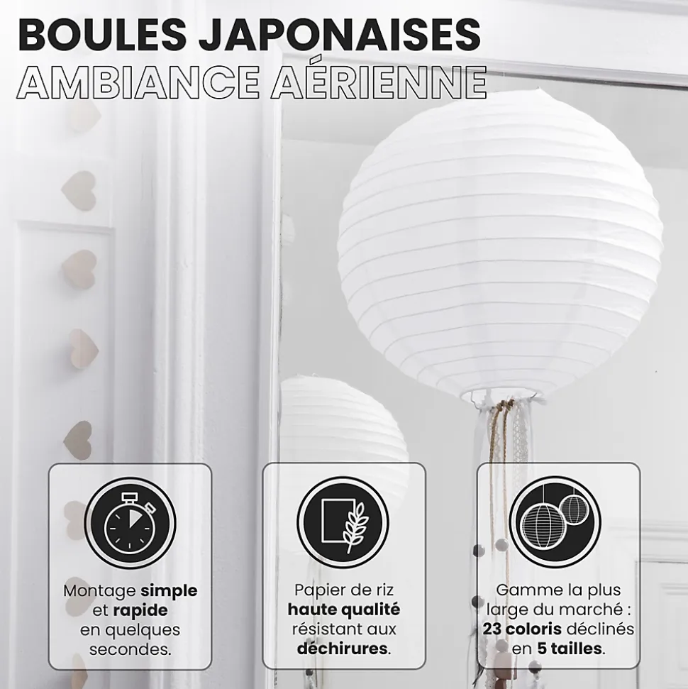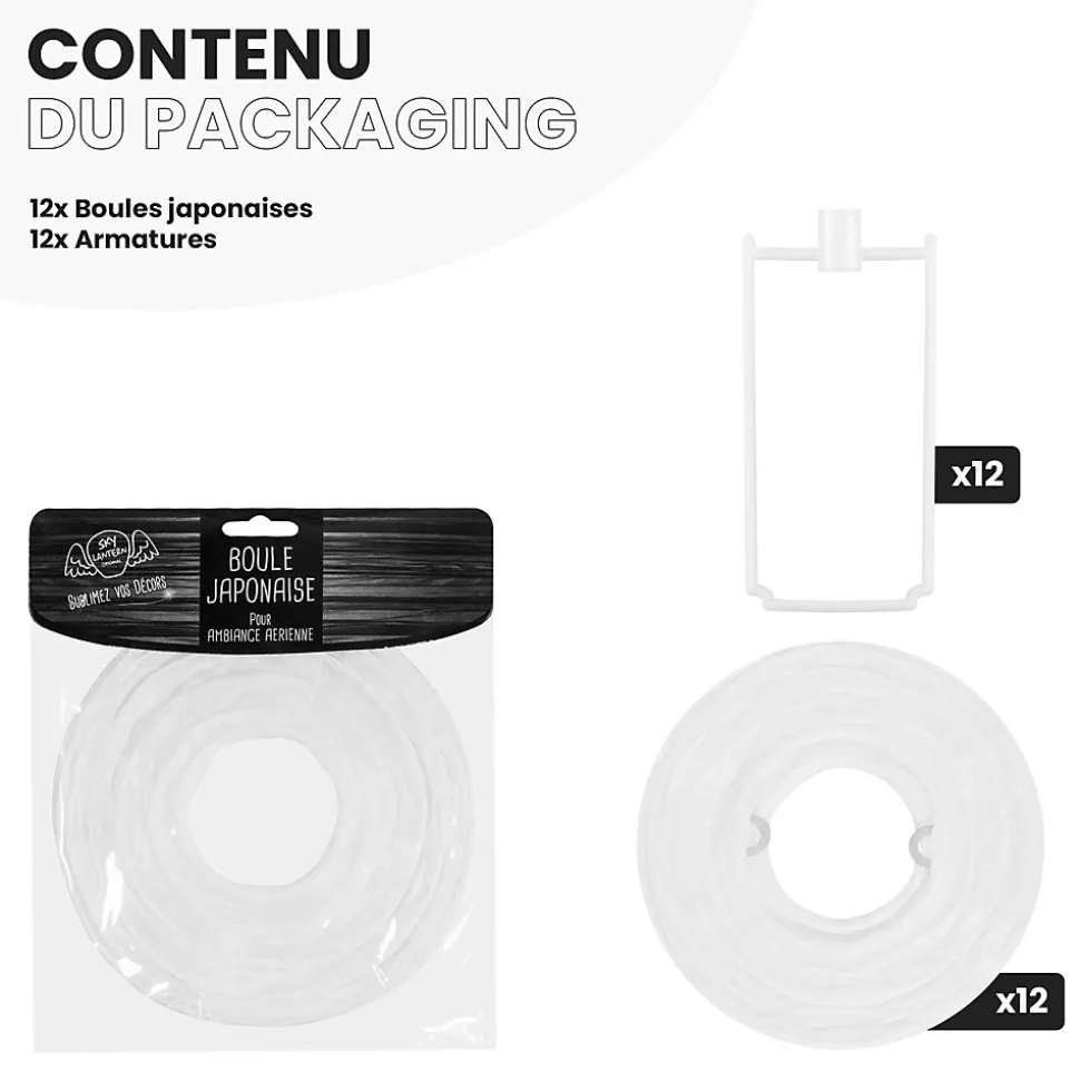Lot de 12 lanternes papier 10 cm : une décoration poétique pour vos événementsApportez une touche d’élégance à votre décoration avec ce lot de 12 boules japonaises blanches de 10 cm. Faciles à installer, ces lanternes en papier de soie créent instantanément une ambiance poétique et authentique pour vos mariages, anniversaires, baptêmes ou fêtes.À suspendre avec du fil de pêche ou une cordelette fine, elles s’intègrent parfaitement dans tous les espaces : salle de réception, tente, terrasse ou jardin. Leur format compact et leur teinte blanche lumineuse s’harmonisent facilement avec tout type de thème ou de décoration.Besoin d’inspiration ? Découvrez nos idées déco pour composer des mises en scène harmonieuses : mixez les tailles, jouez avec les hauteurs, associez ces lanternes à nos lampions LED, étoiles, rosaces ou pompons pour un effet magique et personnalisé.Leur montage est simple et rapide, sans outil. Elles se déplient en quelques secondes et se rangent facilement après usage. Utilisez-les seules ou en complément d’autres produits SkyLantern pour enrichir votre ambiance lumineuse et festive.Si la couleur blanche ne correspond pas à votre thème, explorez nos nombreuses teintes disponibles sur SkyLantern.fr. Nos modèles existent également en 15, 20, 30, 40 et 50 cm.SkyLantern, la référence des décorations lumineusesBasée à Lille, SkyLantern est une marque française reconnue pour ses décorations en papier inspirées de l’art japonais. Nos créations sont régulièrement mises en avant par des professionnels de l’événementiel et la presse déco.