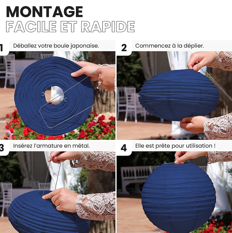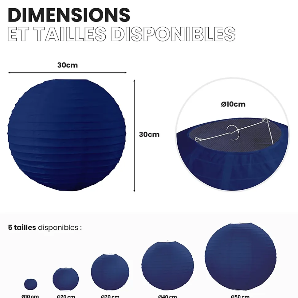 Lot de 12 lanterne papier de 30cm: Une décoration poétique pour tous vos évènementsFini de chercher d’autres idées pour embellir votre lieu de fête, les lanternes chinoises en papier de soie de SkyLantern.fr, vont vous permettre de créer un cadre poétique et authentique en quelques minutes. Epatez vos invités en utilisant votre sens du détail, puis composez en suivant vos idées. Votre lot de 12 boules papier bleu navy de 30 cm devrait vous surprendre grâce à l’éclat de ses teintes sans oublier sa jolie forme qui s’intègre dans tout lieu festif.Lanterne japonaise pour déco mariage bleu navy 30 cm: comment l’utiliser ?Ce type de boule chinoise est pratique pour les mariages, une Bar Mitzvah, une decoration anniversaire. Nos boules papier sont simples à déplier, il ne vous faudra pas longtemps pour décorer votre salle de couleur bleu navy. Le montage ne réclame pas d’outil compliqué. Pour un meilleur rendu, vous pouvez suspendre la suspension luminaire avec du fil de pêche ou de la cordelette. N’hésitez pas à faire passer un filin parcourant les hauteurs. Ces articles se marient bien avec les autres produits SkyLantern, les lampions LED, les étoiles, ou les rosaces. Si jamais la couleur bleu navy n’est pas la couleur dominante dans votre thème, vous pouvez compléter avec l’une des nombreuses teintes disponibles. Mixez différentes tailles en plus du diamètre 30 cm, modèles vendus: de 10 à 50 cm.SkyLantern est une marque française basée à Lille et spécialisée dans la deco japonaise à base de lampion papier. La marque est chaque année mise en avant par le top du top des professionnels de la déco et la presse spécialisée.