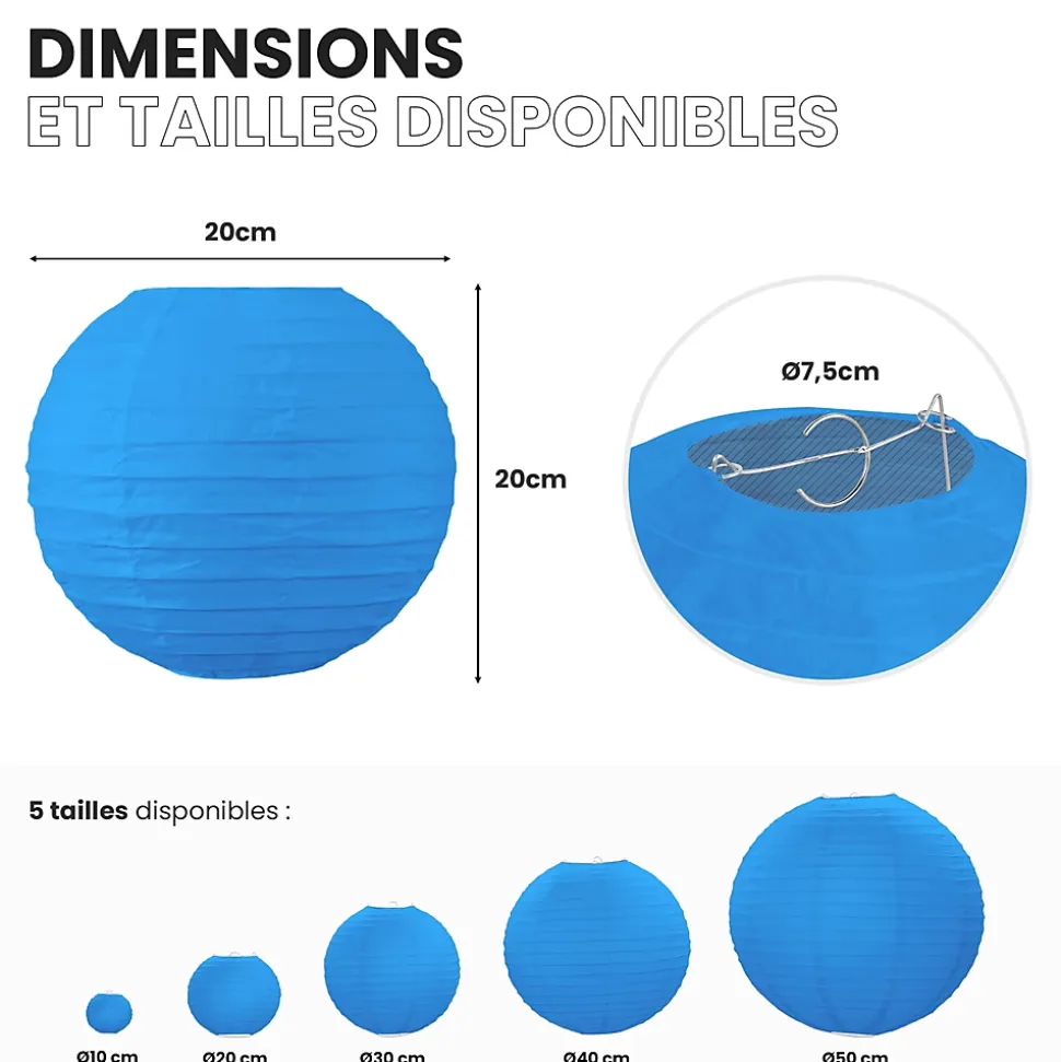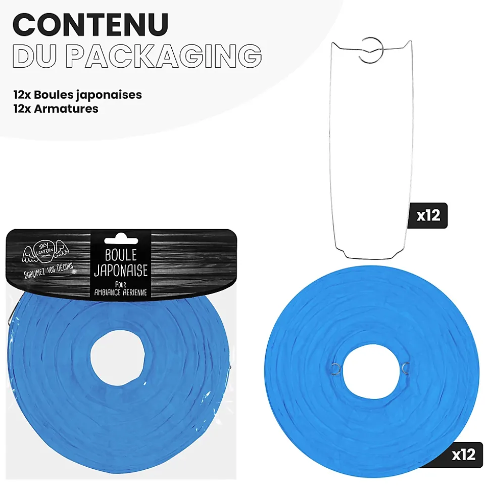 Lot de 12 lanternes papier 20 cm – Bleu roi : une décoration élégante et audacieuseApportez de la profondeur et du caractère à vos événements avec ce lot de 12 boules japonaises en papier bleu roi de 20 cm. Leur teinte intense et raffinée crée une ambiance majestueuse, idéale pour un mariage, un anniversaire, une réception ou une décoration extérieure chic.Très simples à mettre en place, ces lanternes se déplient en quelques secondes et se suspendent à l’aide d’un fil de pêche ou d’une cordelette. Leur format intermédiaire s’adapte à tous les espaces : plafond, tonnelle, arche ou arbre décoratif.Pour enrichir votre ambiance, associez-les à d’autres éléments comme des lampions, rosaces ou pompons. Le bleu roi se marie parfaitement avec des teintes blanches, dorées, argentées ou pastel pour une composition visuelle saisissante et élégante.Disponibles en plusieurs tailles de 10 à 50 cm, ces lanternes permettent de créer du volume et du rythme dans votre décoration. Si le bleu roi n’est pas la couleur dominante de votre thème, vous pouvez l’associer facilement à d’autres nuances de la gamme SkyLantern.SkyLantern, la référence des décorations lumineusesSkyLantern est une marque française basée à Lille, spécialisée dans la décoration japonaise à base de lampions en papier. Reconnue pour la qualité de ses produits, elle est plébiscitée par les professionnels de l’événementiel et la presse déco.