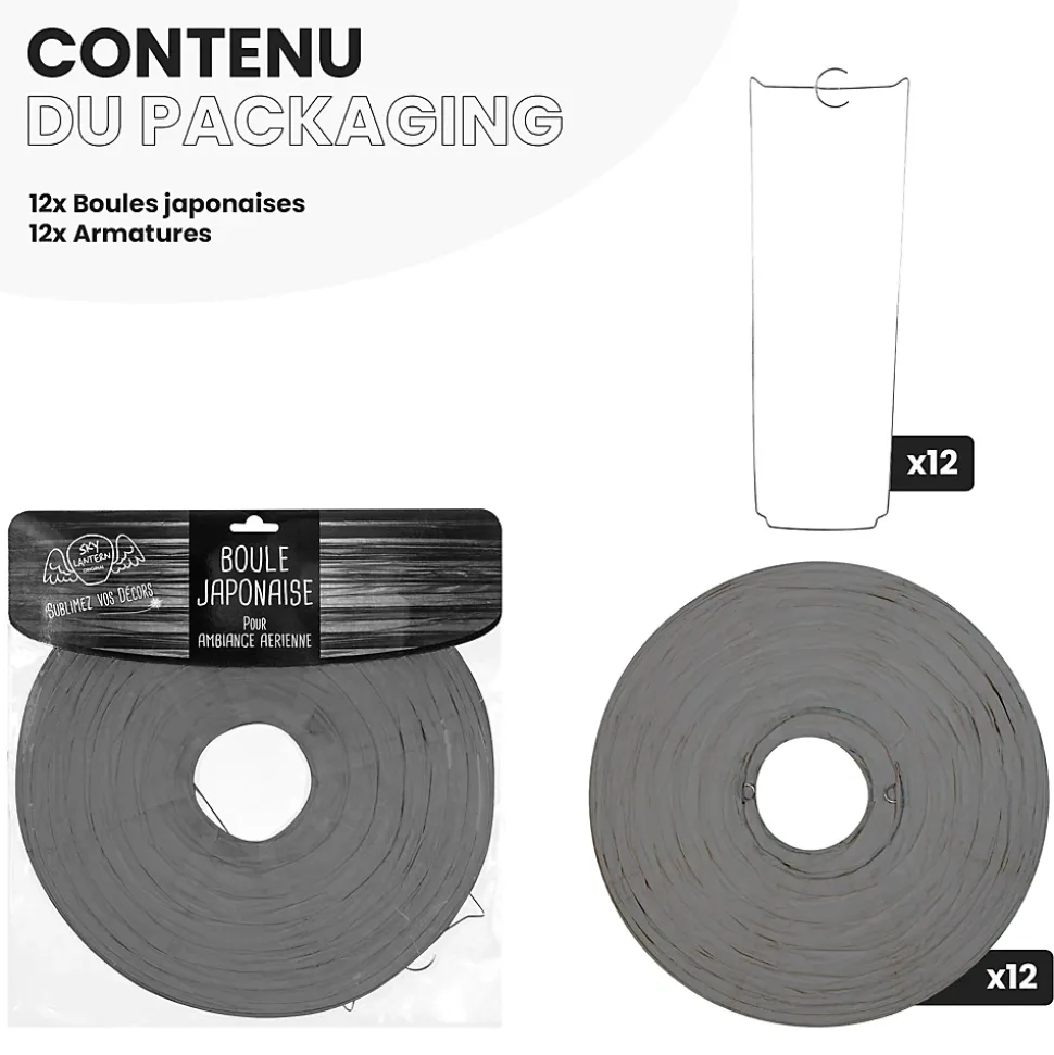 Lot de 12 lanterne papier de 30cm: Une décoration poétique pour tous vos évènementsFini de chercher d’autres idées pour embellir votre lieu de fête, les lanternes chinoises en papier de soie de SkyLantern.fr, vont vous permettre de créer un cadre poétique et authentique en quelques minutes. Epatez vos invités en utilisant votre sens du détail, puis composez en suivant vos idées. Votre lot de 12 boules papier gris de 30 cm devrait vous surprendre grâce à l’éclat de ses teintes sans oublier sa jolie forme qui s’intègre dans tout lieu festif.Lanterne japonaise pour déco mariage gris 30 cm: comment l’utiliser ?Ce type de boule chinoise est pratique pour les mariages, une Bar Mitzvah, une decoration anniversaire. Nos boules papier sont simples à déplier, il ne vous faudra pas longtemps pour décorer votre salle de couleur gris. Le montage ne réclame pas d’outil compliqué. Pour un meilleur rendu, vous pouvez suspendre la suspension luminaire avec du fil de pêche ou de la cordelette. N’hésitez pas à faire passer un filin parcourant les hauteurs. Ces articles se marient bien avec les autres produits SkyLantern, les lampions LED, les étoiles, ou les rosaces. Si jamais la couleur gris n’est pas la couleur dominante dans votre thème, vous pouvez compléter avec l’une des nombreuses teintes disponibles. Mixez différentes tailles en plus du diamètre 30 cm, modèles vendus: de 10 à 50 cm.SkyLantern est une marque française basée à Lille et spécialisée dans la deco japonaise à base de lampion papier. La marque est chaque année mise en avant par le top du top des professionnels de la déco et la presse spécialisée.