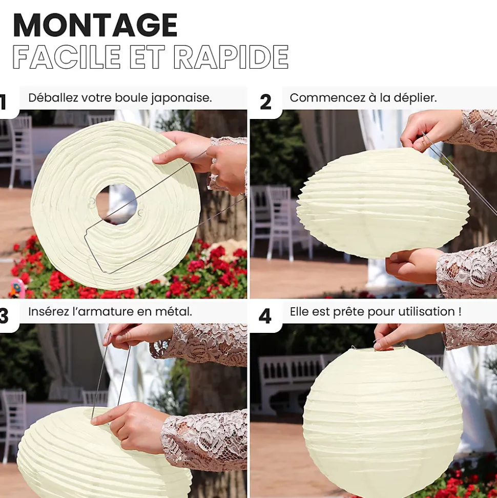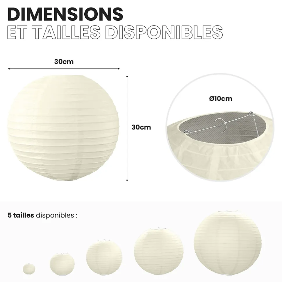 Lot de 12 lanterne papier de 30cm: Une décoration poétique pour tous vos évènementsFini de chercher d’autres idées pour embellir votre lieu de fête, les lanterne chinoise en papier de soie de SkyLantern.fr, vont vous permettre de créer un cadre poétique et authentique en quelques minutes. Épatez vos invités en utilisant votre sens du détail, puis composez en suivant vos idées. Votre lot de 12 boule papier ivoire de 30 cm devrait vous surprendre grâce à l’éclat de ses teintes sans oublier sa jolie forme qui s’intègre dans tout lieu festif.Lanterne japonaise pour déco mariage ivoire 30 cm: comment l’utiliser ?Ce type de boule chinoise est pratique pour les mariages, un baptême, une décoration d’anniversaire. Nos boules papier sont simples à déplier, il ne vous faudra pas longtemps pour décorer votre salle de couleur ivoire. Le montage ne réclame pas d’outil compliqué. Pour un meilleur rendu, vous pouvez suspendre la suspension luminaire avec du fil de pêche ou de la cordelette. N’hésitez pas à faire passer un filin parcourant les hauteurs. Ces articles se marient bien avec les autres produits SkyLantern, les lampions LED, les étoiles, ou les rosaces. Si jamais l’ivoire n’est pas la couleur dominante dans votre thème, vous pouvez compléter avec l’une des nombreuses teintes disponibles. Mixez différentes tailles en plus du diamètre 30 cm, modèles vendus: de 10 à 50 cm.SkyLantern est une marque française basée à Lille et spécialisée dans la deco japonaise à base de lampion papier. La marque est chaque année mise en avant par le top du top des professionnels de la déco et la presse spécialisée.