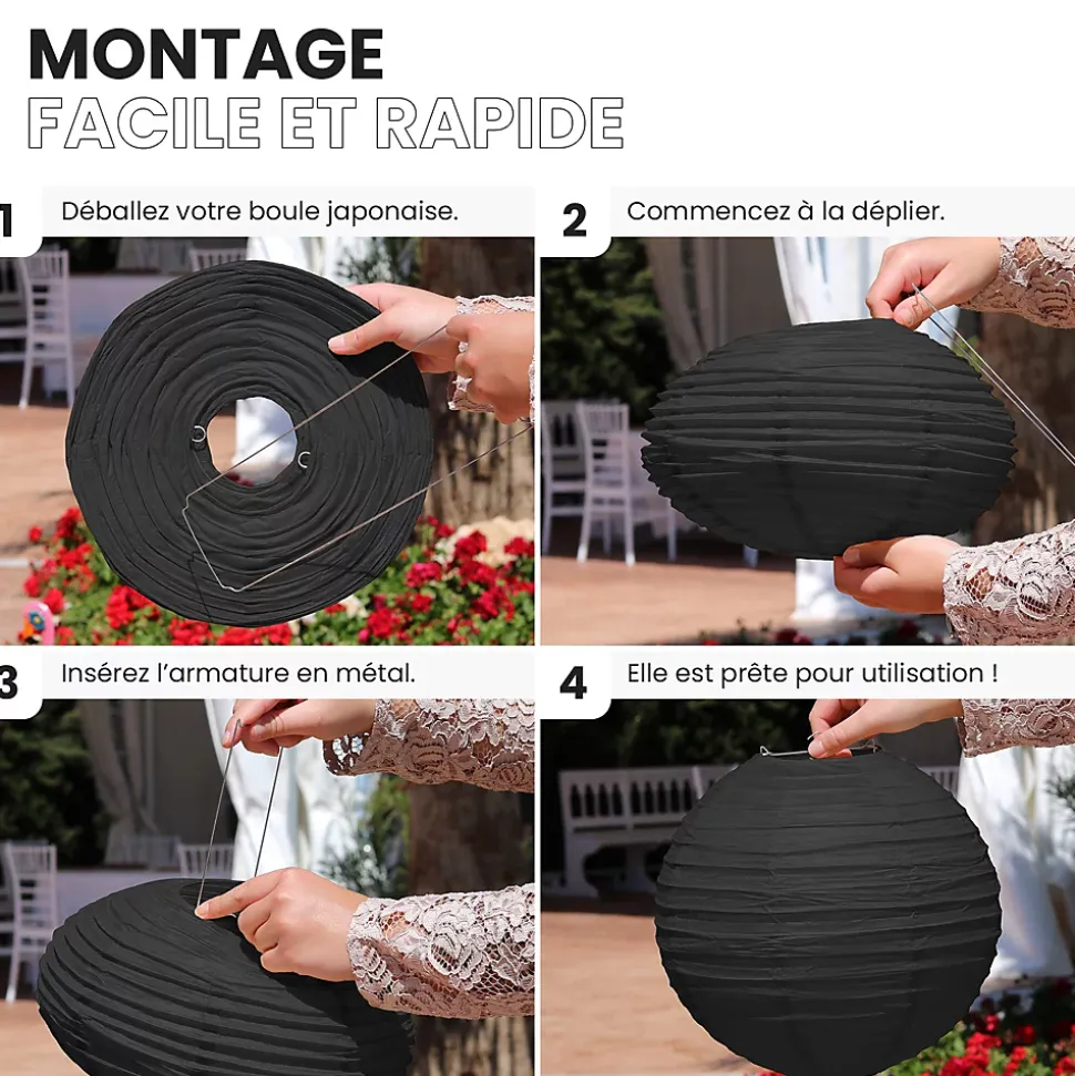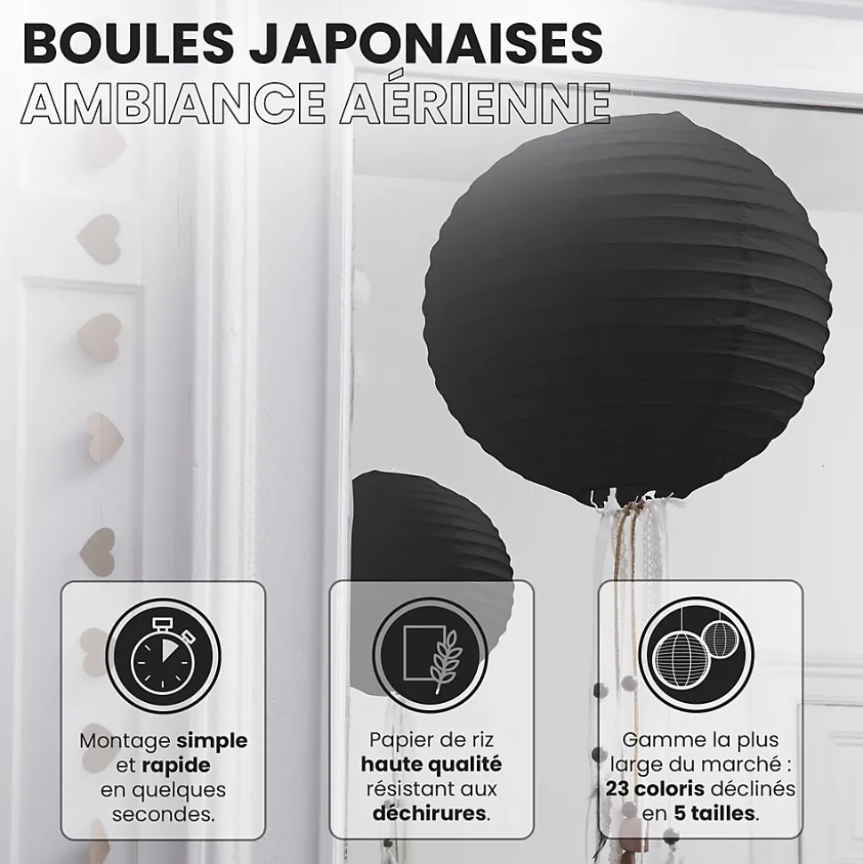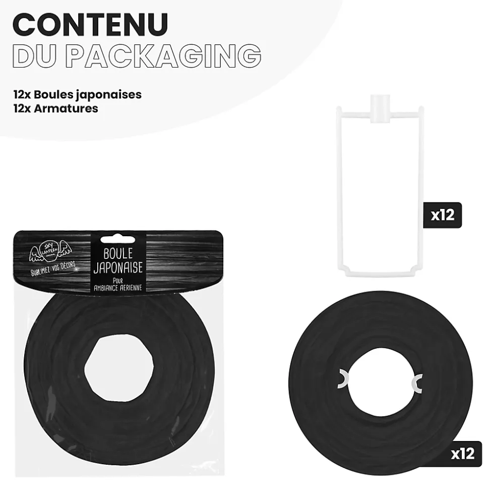 Lot de 12 lanternes papier 10 cm – Noires : une touche chic et originale pour vos événementsAjoutez une dimension élégante à vos décorations avec ce lot de 12 boules japonaises noires de 10 cm. Leur teinte intense et leur forme soignée apportent relief et raffinement à votre ambiance, que ce soit pour un mariage, un anniversaire ou une soirée à thème.Faciles à suspendre avec du fil de pêche ou de la cordelette, ces lanternes s’installent en quelques minutes et transforment instantanément votre lieu en un espace moderne et poétique. Leur format compact leur permet de s’intégrer à toutes les ambiances, que ce soit en intérieur ou en extérieur.Besoin d’inspiration ? Explorez nos idées déco pour sublimer vos événements et osez associer ces lanternes noires à nos lampions LED, pompons ou rosaces. Créez un décor lumineux, contrasté et sophistiqué.Le montage est simple, sans outil : dépliez-les et suspendez-les à différentes hauteurs pour un effet aérien. Combinez-les à d’autres tailles (jusqu’à 50 cm) ou couleurs si le noir ne correspond pas totalement à votre thème.SkyLantern, l’expert des ambiances lumineusesBasée à Lille, SkyLantern est une marque française spécialisée dans la décoration en papier d’inspiration japonaise. Reconnue par les professionnels de l’événementiel, elle allie esthétique, facilité d’usage et créativité.