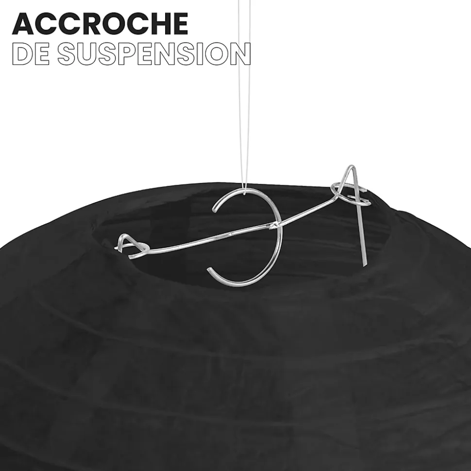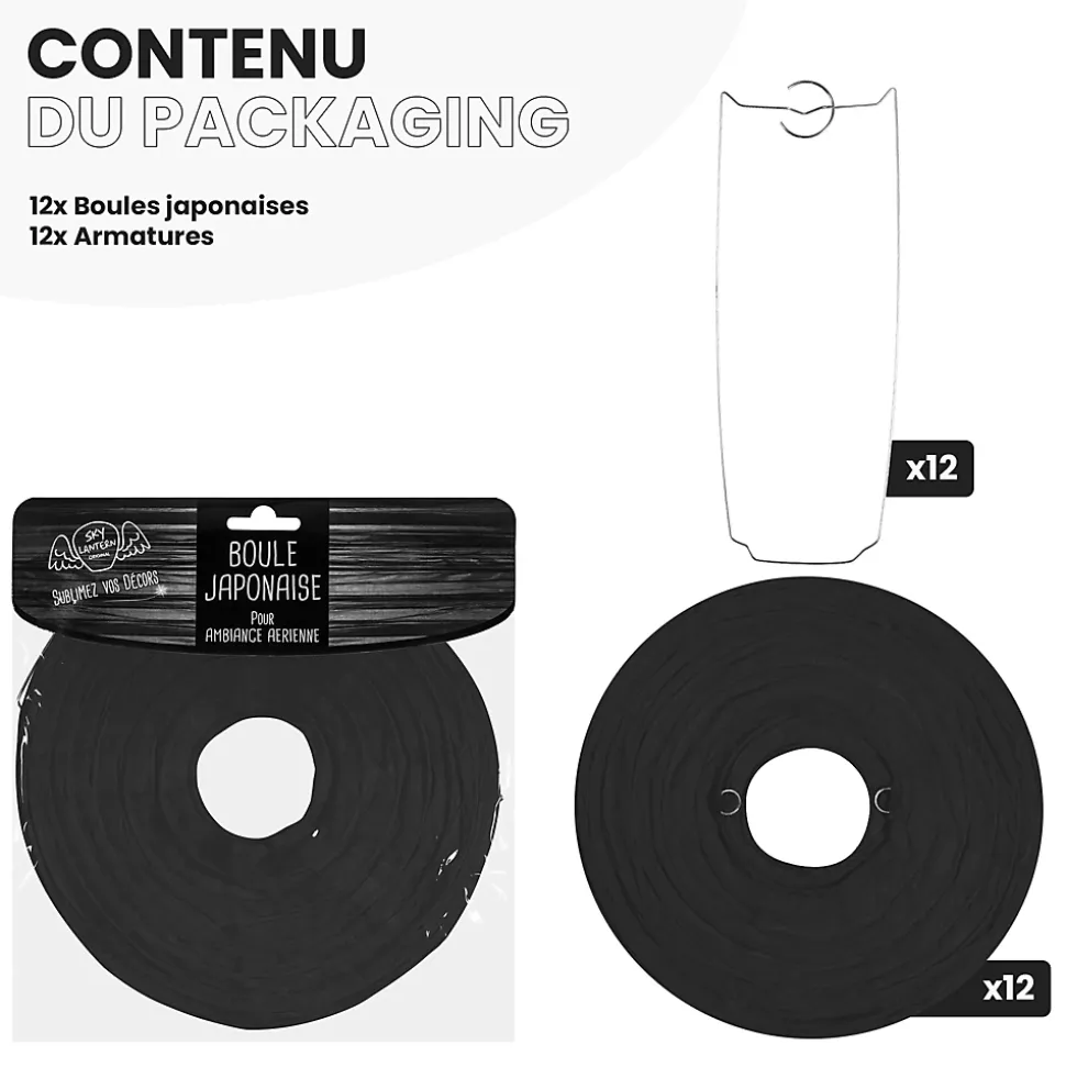 Lot de 12 lanternes papier 20 cm – Noires : une décoration élégante et intemporelleCréez une ambiance chic et originale avec ce lot de 12 boules japonaises en papier noir de 20 cm. Leur teinte intense et leur silhouette soignée apportent du contraste et du raffinement à tous vos événements : mariages, anniversaires, soirées à thème ou réceptions en extérieur.Faciles à suspendre avec du fil de pêche ou une cordelette, ces lanternes se montent sans outil et s’intègrent dans tout type d’espace. Leur format moyen offre un bon équilibre entre impact visuel et légèreté, idéal pour décorer un plafond, une pergola ou une salle de fête.Pour enrichir votre décoration, associez-les à d’autres éléments comme des lampions, pompons ou rosaces. Variez les formes et les hauteurs pour créer une mise en scène dynamique et personnalisée. Le noir se marie parfaitement avec des tons vifs ou pastel pour un rendu contrasté et harmonieux.Ces lanternes sont disponibles en différentes tailles, de 10 à 50 cm. Si le noir n’est pas la couleur principale de votre thème, explorez nos nombreuses autres teintes pour composer une décoration sur mesure.SkyLantern, la référence des décorations lumineusesSkyLantern est une marque française basée à Lille, spécialisée dans la décoration japonaise à base de lampions en papier. Reconnue par les professionnels de l’événementiel et citée dans la presse spécialisée, elle allie esthétisme, qualité et simplicité d’utilisation.