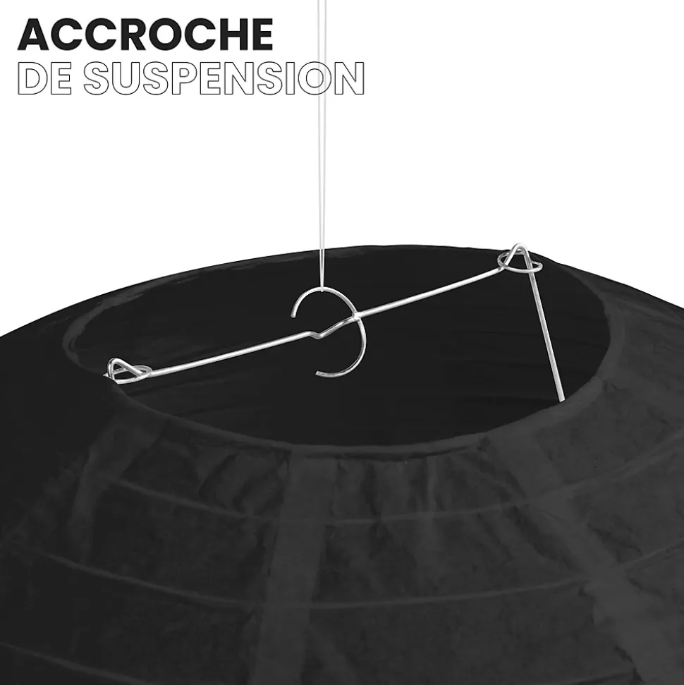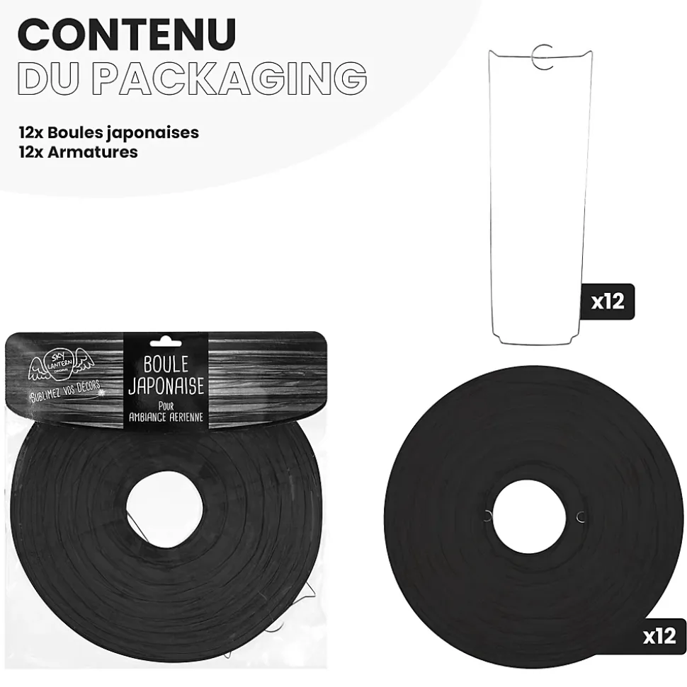 Lot de 12 lanternes papier 30 cm – Une déco poétique pour vos événementsAjoutez une touche élégante à vos fêtes avec ce lot de 12 boules japonaises noires de 30 cm. Fabriquées en papier de soie, elles créent une ambiance poétique et chaleureuse en un clin d’œil. Faciles à monter, elles s’installent rapidement sans outil, à suspendre avec du fil de pêche ou une cordelette.Besoin d’idées déco ? Découvrez 9 inspirations pour mettre en scène vos boules japonaises et jouez avec les hauteurs, les couleurs et les formes.Parfaites pour une déco de mariage, une Bar Mitzvah ou un anniversaire, ces lanternes s’adaptent à toutes vos envies. Pour un rendu encore plus lumineux, associez-les à nos lampions et pompons aux couleurs éclatantes.Si vous préparez une cérémonie, laissez-vous inspirer par notre guide pour créer une allée de mariage décorée avec goût. Une belle mise en scène rendra votre événement inoubliable.Mixez les tailles (de 10 à 50 cm) et les coloris disponibles pour un effet visuel unique. Ces lanternes s’accordent parfaitement avec nos lampions LED, rosaces et étoiles.SkyLantern, la référence des décorations lumineusesMarque française basée à Lille, SkyLantern est reconnue pour ses créations en papier dans l’univers de la décoration festive. Chaque année, ses produits sont plébiscités par les pros et les médias spécialisés.