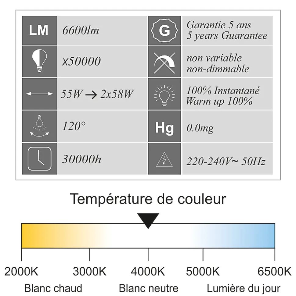 Cette réglette LED de 55W avec LED intégrée est la solution idéale pour remplacer les luminaires étanches à néon 2x58W, offrant une alternative plus performante et économique.Avec son flux lumineux élevé de 6600 lumens et une consommation réduite de 55W seulement, elle garantit des économies d’énergie considérables sans compromis sur la qualité d’éclairage. Sa température de couleur lumière du jour (6500K) assure un éclairage homogène et agréable pour tous types d’environnements professionnels ou industriels.Robuste et parfaitement étancheAvec son indice de protection IP65, cette réglette est totalement étanche à l’eau et à la poussière, idéale pour une installation en environnements exigeants : usines, parkings, garages, ateliers et entrepôts. Son indice de résistance aux chocs IK08 lui confère une excellente durabilité.Installation rapide et pratiqueSystème de câblage traversant permettant le chaînage de plusieurs réglettes sans multiplication des raccordements.Connexion simplifiée pour une installation en saillie ou suspendue en toute facilité.Caractéristiques techniques :Nombre de pièce : 12 piècesPuissance réelle : 55WÉquivalence : 2x58WFlux lumineux : 6600 lm (120 lm/W)Ancienne norme 2012 : A+Nouvelle norme 2021 : ETempérature de couleur : 6500K (lumière du jour)Angle de diffusion : 120°Indice de protection : IP65 (étanche)Indice de résistance : IK08 (antichoc)Durée de vie : 50 000 heuresNombre de cycles ON/OFF : 30 000Facteur de puissance : > 0.9Type de LED : SMDDiffuseur : OpaqueMatériau du cadre : GrisTension : 220-240VInstallation : Saillie ou suspendueDimension : 1500 x 72 x 61 mmNormes : CE, ROHSGarantie : 5 ansApplications :Industrie & entrepôt : Usines, zones de stockageMobilité & stationnement : Parkings, garagesAteliers & locaux professionnels