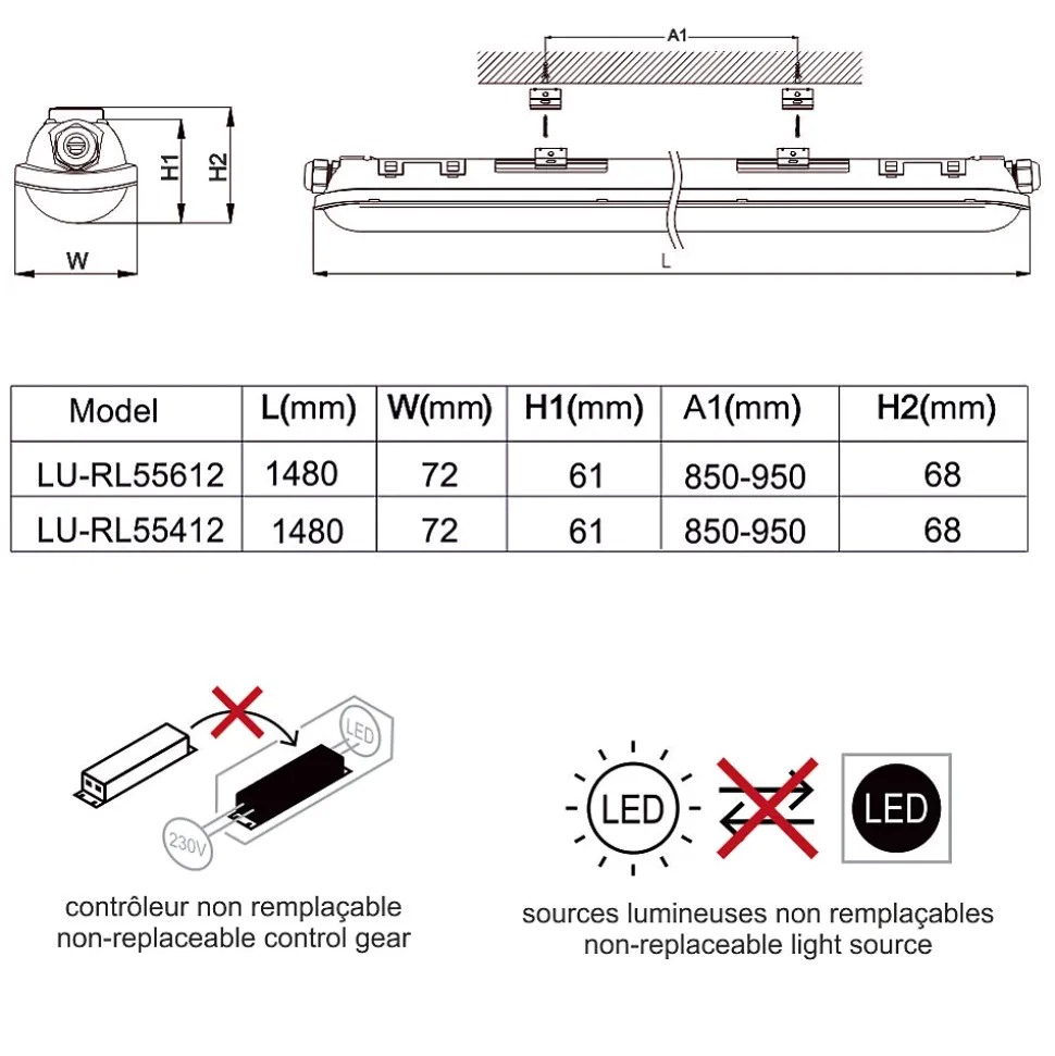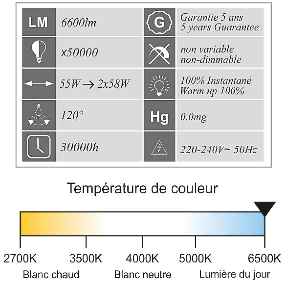 Cette réglette LED de 55W avec LED intégrée est la solution idéale pour remplacer les luminaires étanches à néon 2x58W, offrant une alternative plus performante et économique.Avec son flux lumineux élevé de 6600 lumens et une consommation réduite de 55W seulement, elle garantit des économies d’énergie considérables sans compromis sur la qualité d’éclairage. Sa température de couleur lumière du jour (6500K) assure un éclairage homogène et agréable pour tous types d’environnements professionnels ou industriels.Robuste et parfaitement étancheAvec son indice de protection IP65, cette réglette est totalement étanche à l’eau et à la poussière, idéale pour une installation en environnements exigeants : usines, parkings, garages, ateliers et entrepôts. Son indice de résistance aux chocs IK08 lui confère une excellente durabilité.Installation rapide et pratiqueSystème de câblage traversant permettant le chaînage de plusieurs réglettes sans multiplication des raccordements.Connexion simplifiée pour une installation en saillie ou suspendue en toute facilité.Caractéristiques techniques :Nombre de pièce : 12 piècesPuissance réelle : 55WÉquivalence : 2x58WFlux lumineux : 6600 lm (120 lm/W)Ancienne norme 2012 : A+Nouvelle norme 2021 : ETempérature de couleur : 6500K (lumière du jour)Angle de diffusion : 120°Indice de protection : IP65 (étanche)Indice de résistance : IK08 (antichoc)Durée de vie : 50 000 heuresNombre de cycles ON/OFF : 30 000Facteur de puissance : > 0.9Type de LED : SMDDiffuseur : OpaqueMatériau du cadre : GrisTension : 220-240VInstallation : Saillie ou suspendueDimension : 1500 x 72 x 61 mmNormes : CE, ROHSGarantie : 5 ansApplications :Industrie & entrepôt : Usines, zones de stockageMobilité & stationnement : Parkings, garagesAteliers & locaux professionnelsUn éclairage puissant, économique et durable pour tous vos espaces !