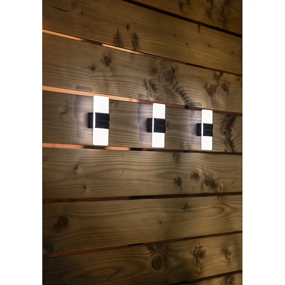 Lot de 2 Appliques murales à énergie solaireCette référence existe également à l’unité, en lot de 4 et en lot de 6, voir les pages respectives.Matière : ABS / acryliqueNombre de Lumens : Durée maximum d’éclairage : 8 heuresInterrupteur blanc froid / off / blanc chaudFixation par vis fournis LED : 12 LED SMD (6x blanc chaud + 6x blanc froid)Batteries rechargeables : 1 x 600mAh Ni-Mh AAADimensions produits : (voir le schéma technique parmi les images)Longueur : 60 -Profondeur : 30 -Hauteur : 140 mm