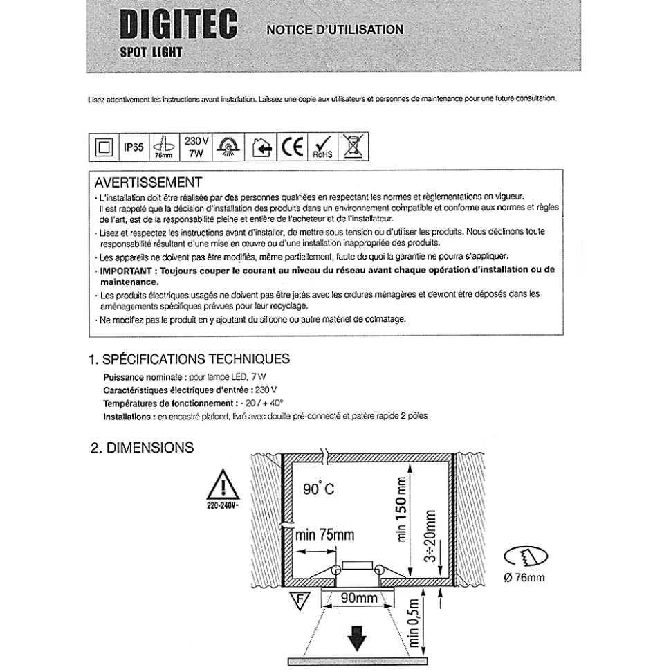 2 pièces x Spot Led Etanche 7W 595Lm IP65Température de couleur : Blanc Chaud 3000KPuissance consommée : 7WFlux lumineux : 595 LumensTension nominale : AC 220-240VDiamètre du spot : ø90xH40 mmDiamètre d’encastrement : ø70 mmCouleur du produit (y compris le cadre) : BlancIndice de protection : IP 65Garantie fabricant : 2 ans