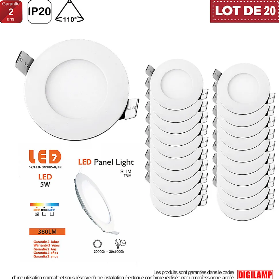 Température de couleur : Blanc Chaud 3000K Puissance consommée : 5W Flux lumineux : 375 Lumens Diamètre du spot : ø83*13mm Diamètre de perçage : ø70mm Couleur du produit (y compris le cadre) : BlancGarantie fabricant : 2 ans Indice de protection : IP 20 Trouvez un offre LOT DE 50pcs : 2.53€ /Pc (Lot de 50 Spot Encastrable Led Downlight Panel Extra plat 5w Blanc Chaud 3000k – Digilamp)