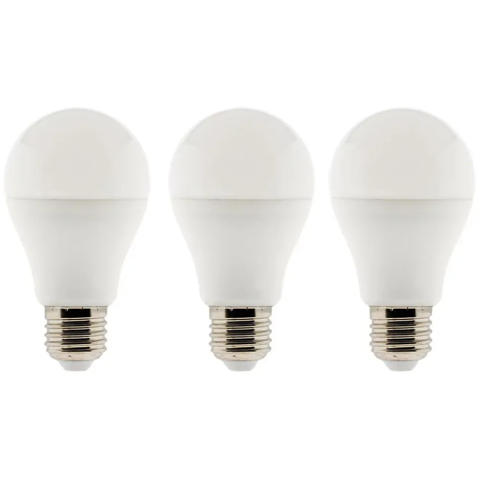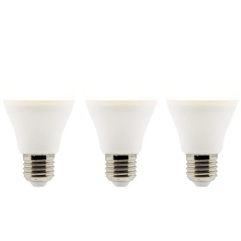 Lot de 3 ampoules LED E27 – 6W – Blanc chaud – 470 Lumen – 2700K – A+ – Zenitech Lot de 3 ampoules LED E27. Puissance de 6 watts et intensité lumineuse de 470 lumens. Température de la lumière de 2700 kelvins. Étiquette énergétique A+ pour une efficacité énergétique élevée. Certifiées CE. Garantie de 2 ans.