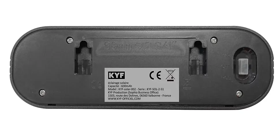 Esthétique et facile à installer, l’applique solaire KYF-SOLAR-002 est l’éclairage parfait pour vos soirées en extérieur. Complètement autonome, elle s’allume et s’éteint automatiquement grâce à son panneau solaire intégré, captant l’énergie du soleil pour un fonctionnement optimal.Modes d’éclairage personnalisables :Mode 1 : Blanc chaud (3000K), pour une ambiance douce et chaleureuse.Mode 2 : Multi-couleur (RVB), avec rotation automatique pour un effet festif et dynamique.Avec une luminosité de 25 lumens, elle offre jusqu’à 15 heures d’autonomie après une journée de charge (8 heures au soleil). Vous pouvez facilement passer d’un mode à l’autre ou éteindre l’applique via un simple bouton.Installation rapide et robuste :Livrée avec un kit de fixation, elle s’installe en un clin d’œil sur vos terrasses, balcons, jardins, chemins ou entrées. Résistante aux intempéries (IP65) et aux températures extrêmes (-10°C à +45°C), elle reste fonctionnelle et durable tout au long de l’année.Caractéristiques techniques :LED : 11x 2835SMD + 4x RVBBatterie intégrée : AA Ni-MH 1,2 V 600mAhPanneau solaire : 2V, 1.5WDimensions compactesAjoutez une touche élégante à vos extérieurs avec l’applique solaire KYF-SOLAR-002, l’alliée idéale pour illuminer vos soirées avec style et simplicité.