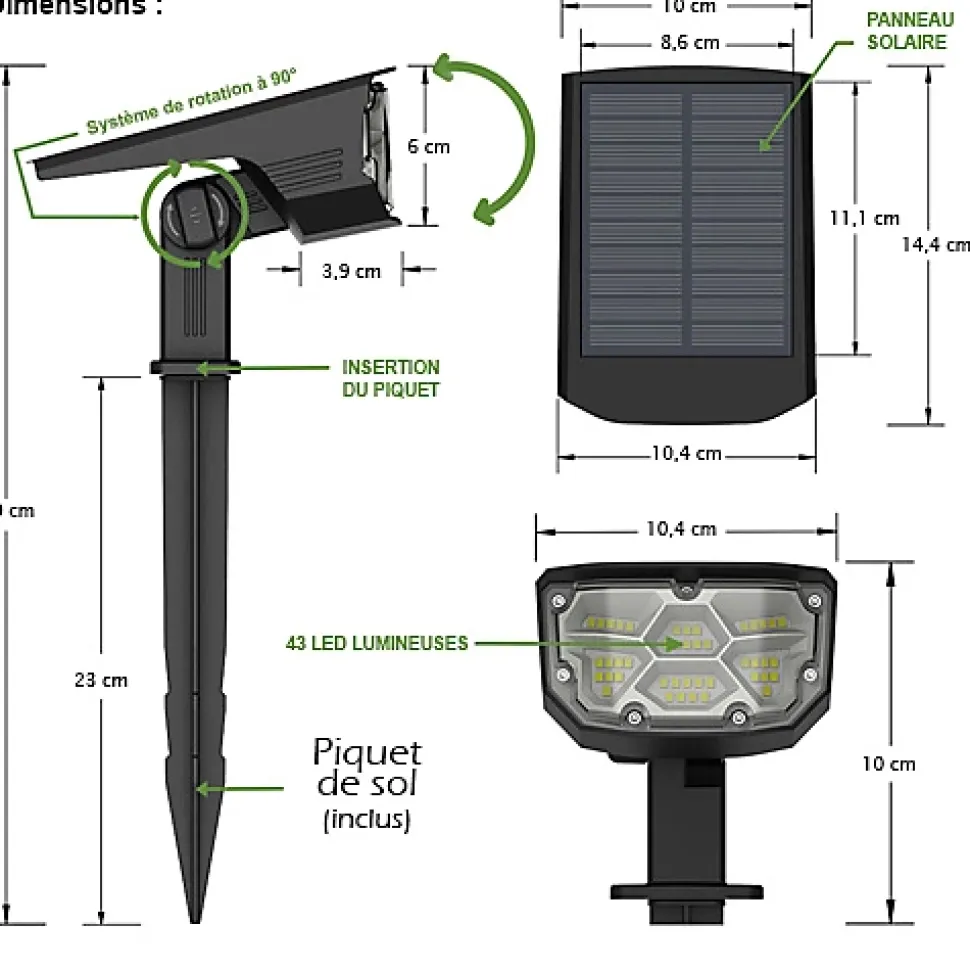 - Double option d’installation : Utilisable comme projecteur de sol avec un piquet ou comme applique murale grâce à son support ajustable, offrant une grande flexibilité d’usage.