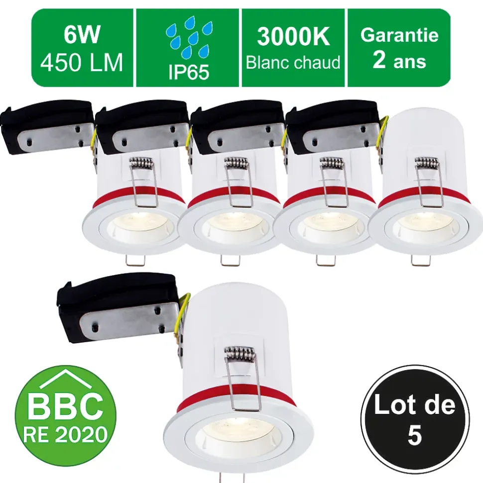 Ces supports de spot encastrables GU10 sont spécialement conçu pour les environnements humides, notamment les salles de bain. Avec son indice de protection IP65, ils peuvent être installés au-dessus d’une douche (hors volume 1), garantissant une résistance optimale à l’humidité.Conforme aux normes Bâtiment Basse Consommation (BBC) et RE2020Étanchéité à l’air et à l’eau : évite les pertes thermiques et protège votre installation électrique de l’humidité.Retardateur de flamme 90 minutes pour une sécurité renforcée en cas d’incendie.Connexion automatique sans tournevis, facilitant une installation rapide et efficace.Branchement sécurisé : support relié à la terre pour une protection optimaleÉclairage économique et confortableCes spots sont fourni avec une ampoule LED GU10 de 6W (équivalent 35W) en blanc chaud 3000K, offrant un éclairage doux et agréable tout en réduisant votre consommation d’énergie. leurs angle de diffusion de 38° assurent une répartition homogène de la lumière.Caractéristiques techniquesNombre de spot : 5 piècesType : Spot encastrable étancheAmpoule incluse : GU10 LED 6W – 450lm – 3000K (blanc chaud)Ancienne norme 2012 : A+Nouvelle norme 2021 : FNorme BBC (RE2020) : Oui (étanchéité à l’air et à l’eau)Indice de protection : IP65 (résistant à l’eau et à la poussière)Puissance équivalente : 35W halogèneAngle de diffusion : 38°Connexion : Automatique, sans tournevisRetardateur de flamme : 90 min (BS476)Tension : 220-240VDimensions : Ø90 x 95 mm, perçage Ø75 mmCouleur du cadre : BlancDurée de vie : 15 000 heuresGarantie : 2 ansUne solution d’éclairage fiable et durableCe spot encastrable est la solution idéale pour un éclairage sécurisé, économique et esthétique dans votre salle de bain et autres pièces humides.