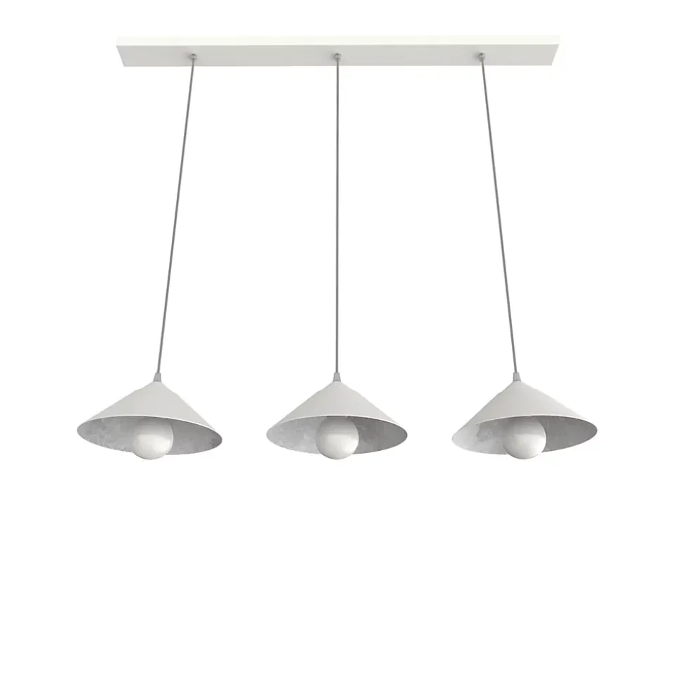 Chapeau Binario, au design moderne en forme de cône, est parfait pour illuminer vos pièces avec style et élégance. Fabriquée en métal de haute qualité, cette lampe garantit une finition spectaculaire et une longue durée de vie.La lampe est composée de 3 diffuseurs métalliques d’un diamètre de 25cm qui assurent un éclairage homogène et réparti.CARACTÉRISTIQUES TECHNIQUESDimensions : 69×6.5x120cmPuissance : 42 W maximumTension : 220-230 VCâble : le câble a une longueur maximale de 120 cm et est réglable vous permettant de régler facilement la hauteur de la lampe.UTILISATION : Profitant du charme des lampes de forme conique, Chapeau Binario est le choix idéal pour l’éclairage intérieur de la maison et s’adapte parfaitement à tout style de mobilier. Cette lampe est parfaite pour les salles à manger, les chambres, les cuisines, les bureaux, les salons, donnant à n’importe quel environnement une touche de classe et de raffinement.La douille E27 facilite le remplacement en cas de casse, assurant une gestion simple et pratique. Nous vous conseillons d’utiliser une ampoule à haute efficacité énergétique d’une luminosité d’environ 1500 lumens, idéale pour éclairer une surface d’environ 12 m2 en lumière directe.
