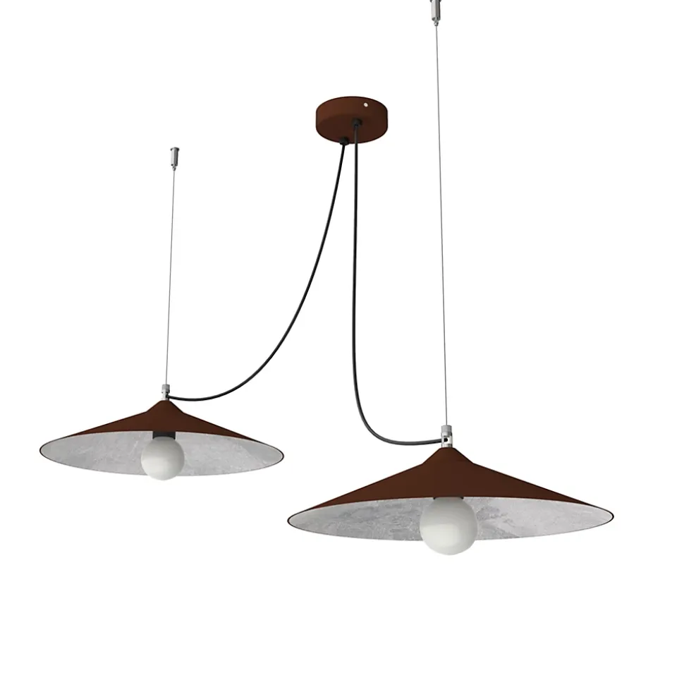 Colombo est une composition de lampes à suspension en métal peint avec intérieur recouvert de feuille de métal appliquée à la main. Petite sœur de la version à trois haut-parleurs, elle tire son nom des trois caravelles de Christophe Colomb. Le produit est divisé en deux diffuseurs coniques, chacun placé à une hauteur différente. Diffuseurs disponibles en simple diamètre 40cm.