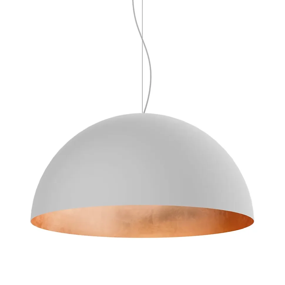 La lampe à suspension VENICE dispose d’un élément d’éclairage adapté aux intérieurs, équipé d’une douille pour ampoules E27. Venice, au design minimaliste et moderne, est composé d’une pavillon et d’un diffuseur en métal enduit de poudre époxy et est disponible en trois tailles : 40, 60 et 80 centimètres de diamètre. Le produit, disponible dans une version recouverte de feuille d’or, d’argent ou de cuivre, peut être, comme tous nos corps lumineux, personnalisés selon les besoins individuels de nos clients grâce à la production « just in time » de notre entreprise. 80% des composants Venice peuvent être remplacés en cas de dommage, conformément à la norme sur l’éco-design entrée en vigueur depuis septembre 2021. La suspension Venice est entièrement fabriquée dans nos usines avec des produits et éléments 100% Made in Italy.
