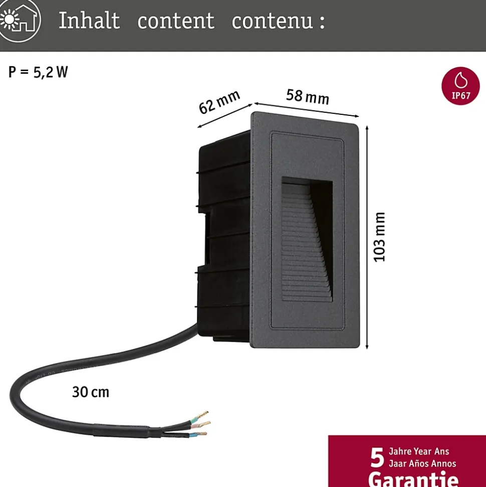 La lumière ne doit pas toujours venir d’en haut : L’encastré mural High en Aluminium, dans les dimensions 103x58mm est conçue spécialement pour le montage mural, il crée des effets lumineux attrayants et augmente la sécurité en éclairant à l’extérieur. Ce luminaire doté d’une température de couleur agréable de 3 000K est résolument étanche et inoxydable grâce à sa protection IP44.
