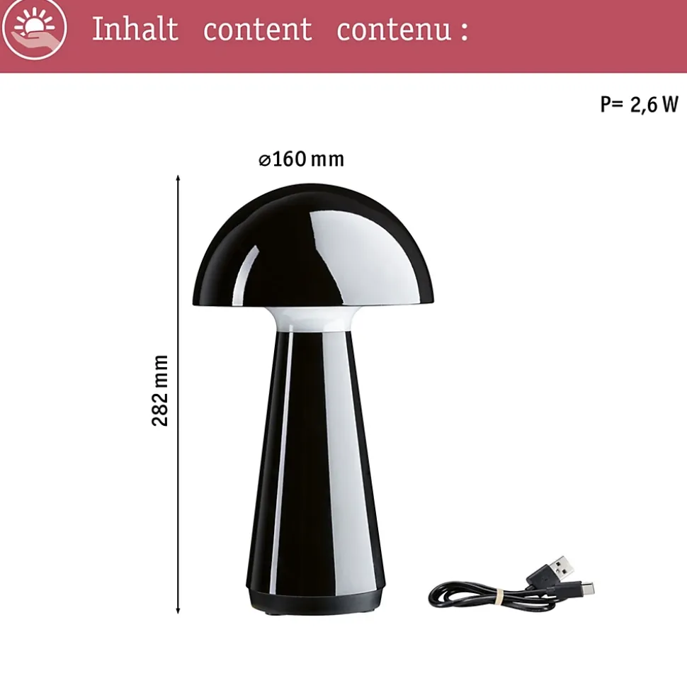 Intégration parfaite dans l’environnement grâce à la dimension compacte et le coloris intemporel du boîtier|Utilisable n’importe où même sans prise électrique grâce au fonctionnement sur batterie|Chargement simple de la batterie intégrée grâce à un câble USB|Température de couleur: 2700K – Blanc chaud|le type de protection: IP44 – convient pour locaux humides ou extérieur