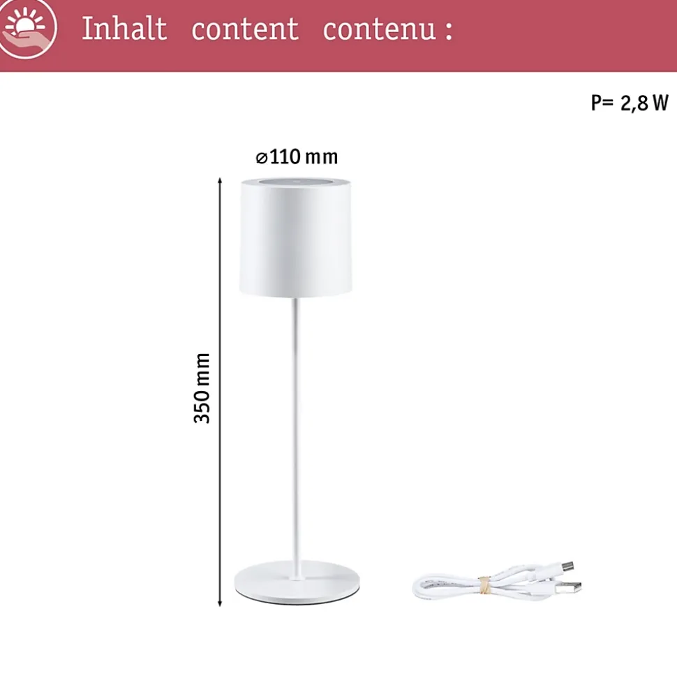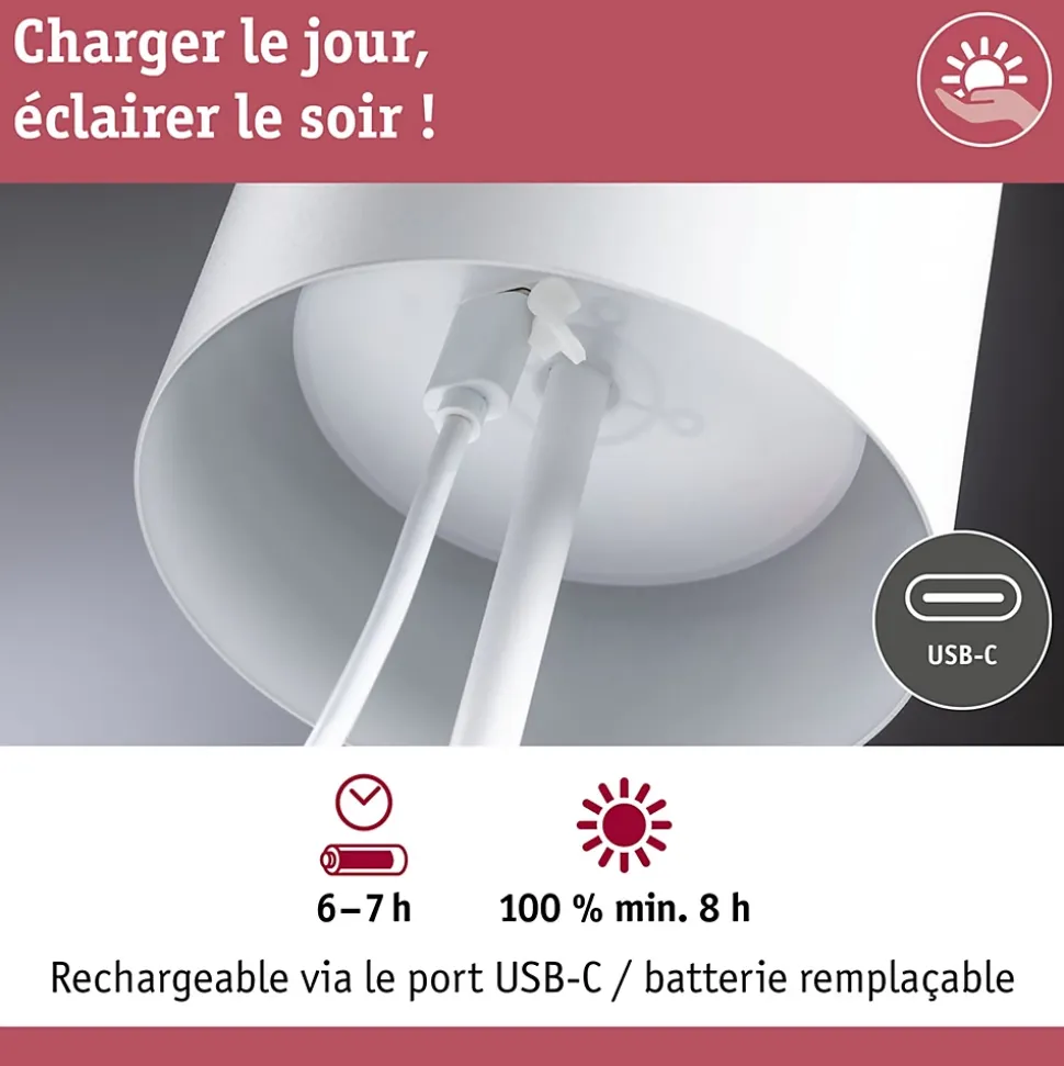 Intégration parfaite dans l’environnement grâce à la dimension compacte et le coloris intemporel du boîtier|Utilisable n’importe où même sans prise électrique grâce au fonctionnement sur batterie|Chargement simple de la batterie intégrée grâce à un câble USB|Température de couleur: 2700K – Blanc chaud|le type de protection: IP44 – convient pour locaux humides ou extérieur