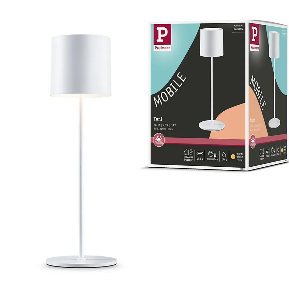 La lampe à poser LED mobile à batterie Tuni avec IP44 en Blanc dépoli avec ses dimensions de 105 x 350 mm est compacte et maniable. Elle ne nécessite aucun branchement électrique et peut être utilisée individuellement à l’intérieur comme à l’extérieur. Que ce soit au Camping, sur la terrasse ou le balcon, au restaurant ou dans le salon – cette lampe à poser à batterie est utilisable partout. Son design réduit et intemporel permet une utilisation universelle et flexible. Elle crée en outre une agréable ambiance lumineuse blanc chaud et convainc par ses matériaux et sa finition de haute qualité, qui lui confèrent une longue durée de vie. Le temps de charge court de 5 à 6 heures permet une longue durée d’éclairage jusqu’à 10 heures à pleine luminosité (100 %). La lampe à poser à batterie peut être rechargée via le port USB-C et dispose d’une fonction de variation d’intensité en continu tactile.