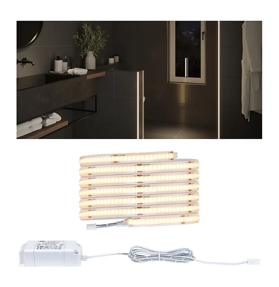 Bandes LED ultra-fines, de largeur réduite à 8 mm|Compatible avec toutes les installations : Strips sécables tous les 25 mm|Nouvelle technologie COB-strips avec 544 LED/m|Revêtement protecteur IP44 contre les aspersions|Type de lumière homogène continu, sans points lumineux, en combinaison avec le profilé