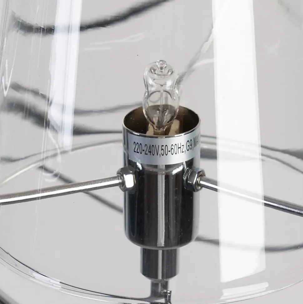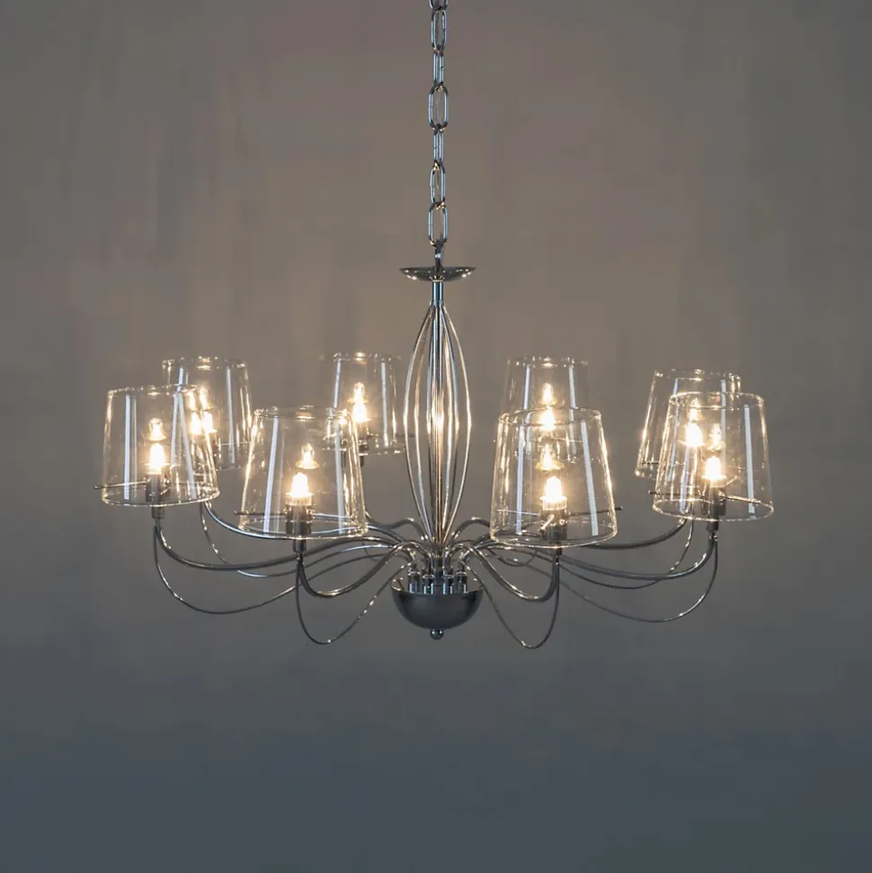 Transformez votre espace avec le lustre Matane à huit bras au design minimaliste. Les huit bras courbés en métal chromé et les abat-jours en verre transparent confèrent à ce luminaire une élégance discrète. Grâce à sa lumière douce et chaleureuse, il crée une ambiance agréable dans toute votre maison.) Assemblage à faire par vos soins (