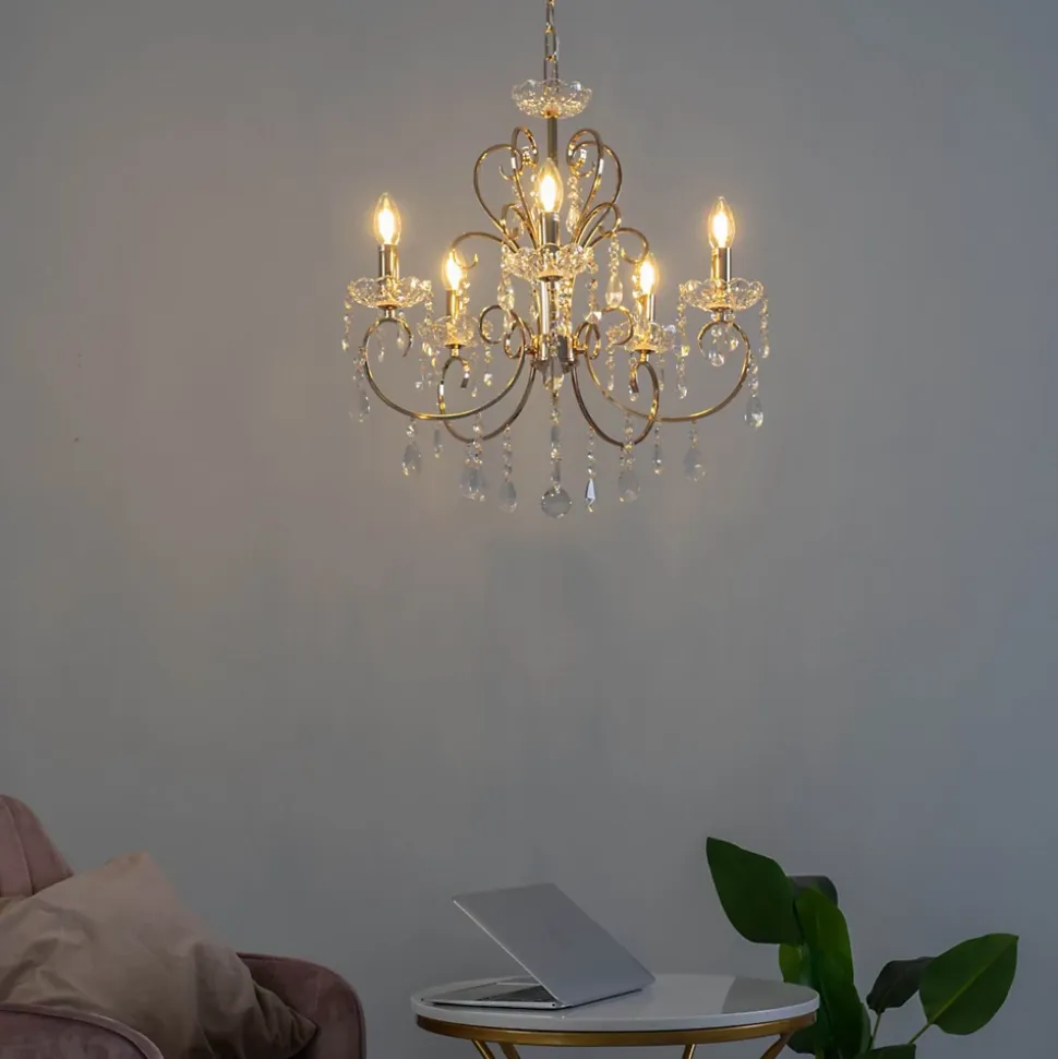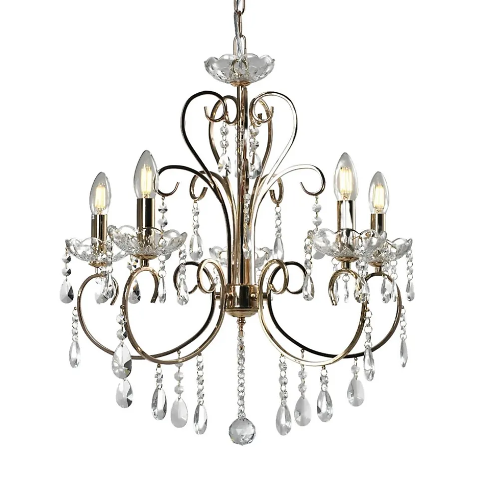 Splendide lustre en métal doré Pavia de style baroque. Cette suspension est richement ornée par ces 5 branches dorées sur lesquelles sont posées des coupelles en verre. Les pampilles en cristal qui y sont attachées subliment l’élégance de ce lustre.) Assemblage à faire par vos soins (