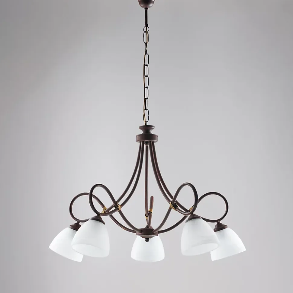 Lustre en fer laqué noir à décor effet rouille et finition or antique avec diffuseurs en verre d’albâtre blanc diamètre 13, 5 lumières – H.52 – MAX 112 – Ø69 Mesures du produit : H