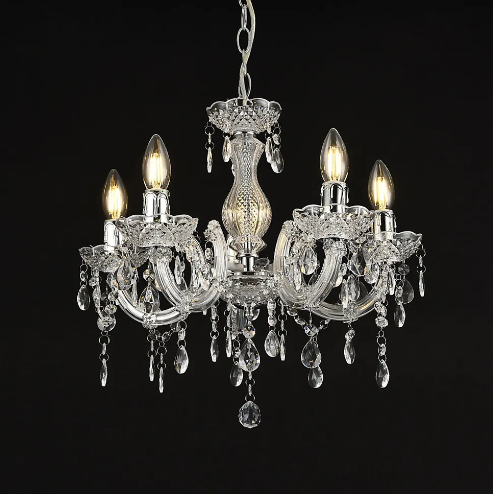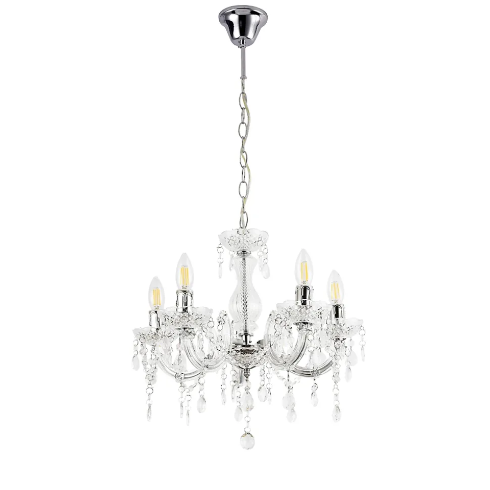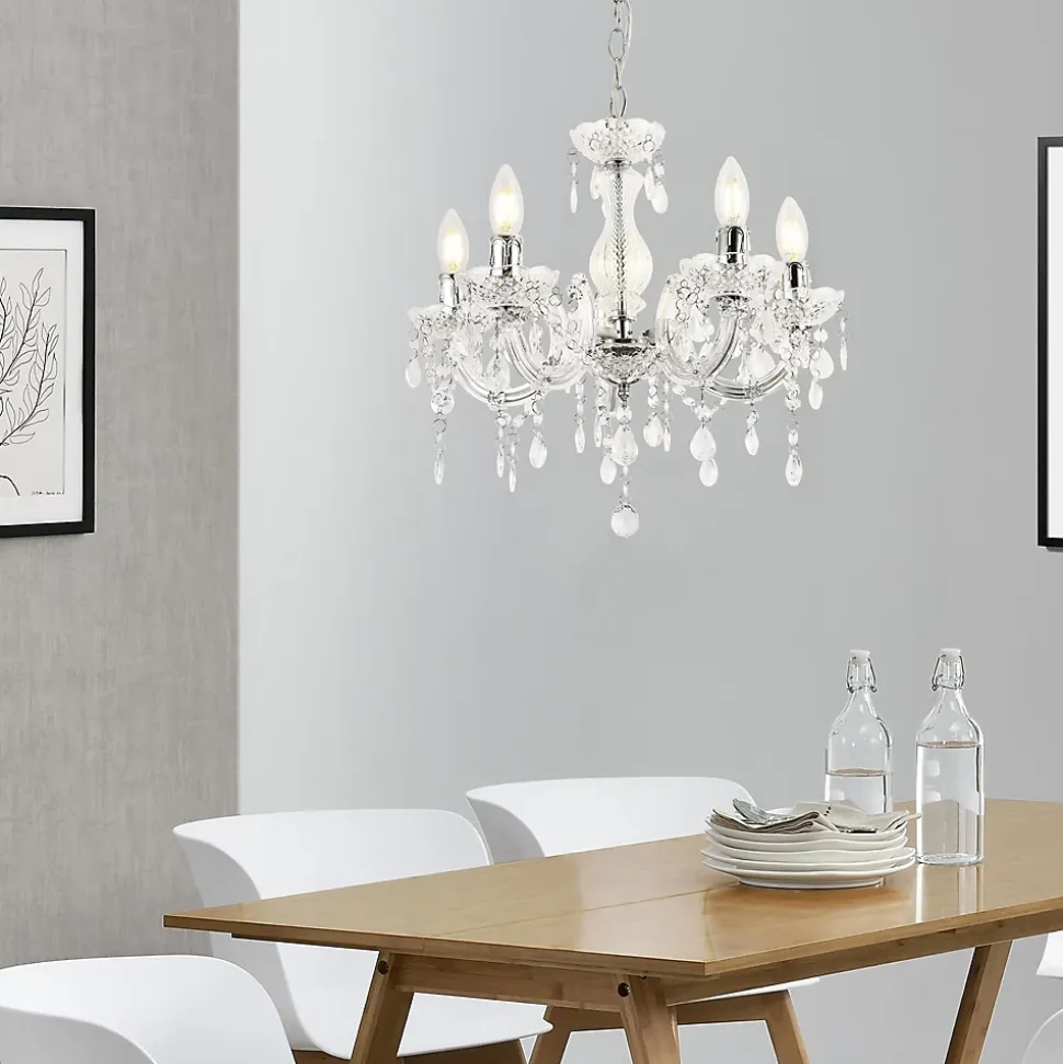 Lustre élégant Notre lampe suspendue élégante de la marque [lux.pro]® est l’accessoire idéal pour votre salon, séjour, chambre ou salle à manger. Description : – Lustre de haut-qualité – éclairage effectif – Design élégant : avec chaîne et crystal platique Modèle : Weimar Alimentation : 230V, 50Hz Commutateur : mural Douille : 5 x E14, max. 40W (Livraison sans agent lumineux) Matière : Métal, plastique Couleur : BlancDimensions : Entière (avec câble) : env. 145 cm Diamètre &⌀ : env. 35 cmCE-signe, RoHs-conform Contenu du paquet : 1 x Lustre [sans agent lumineux] Produit de la marque [lux.pro]®