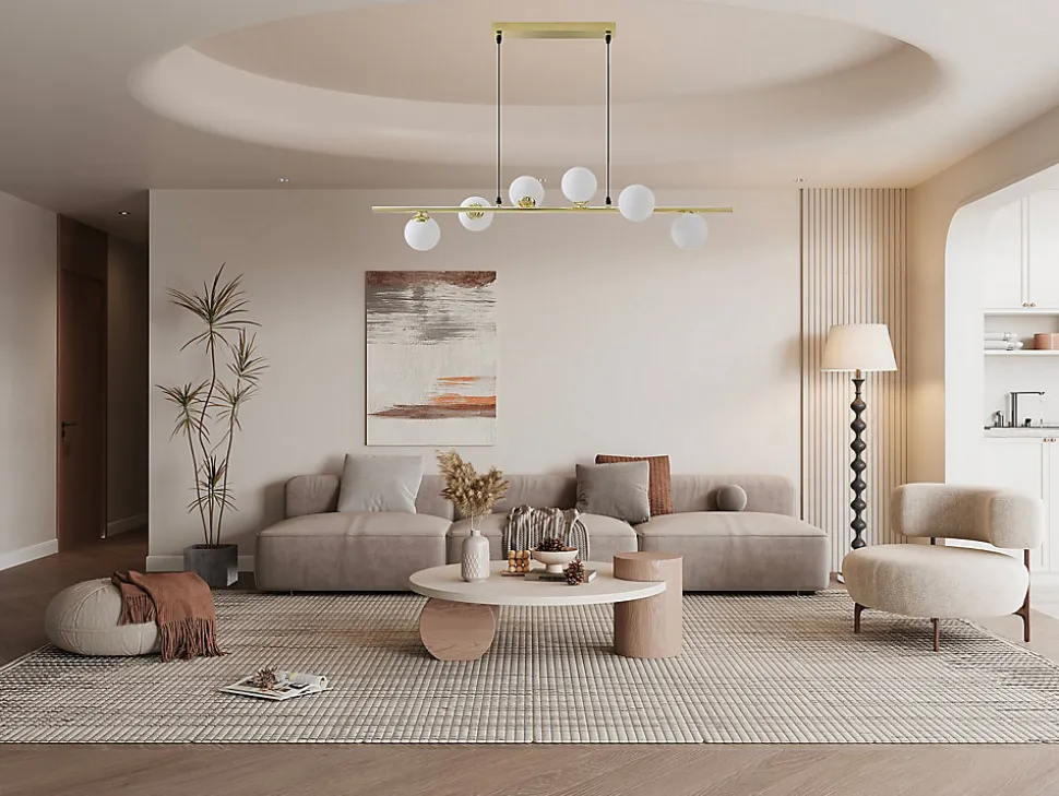 La suspension INUNTA se distingue par sa silhouette composée de six globes répartis avec équilibre et légèreté. Son design minimaliste en fait un choix audacieux pour sublimer un salon, une salle à manger ou une entrée. À la fois graphique et élégante, elle apporte une touche contemporaine et lumineuse à votre intérieur.Caractéristiques Couleur (nuance) : Doré Matière (précision) : Acier Epaisseur métal : 10 mm Finition : Brillant Indice de protection : IP20 Puissance max par lumière (Watts) : 3 W Type de douille : G9 Nombre de douilles : 6 Livré montéDimensions Longueur : 100 cm Hauteur : 120 cm Profondeur : 24.5 cm Longueur du câble : 100 cmLivraison