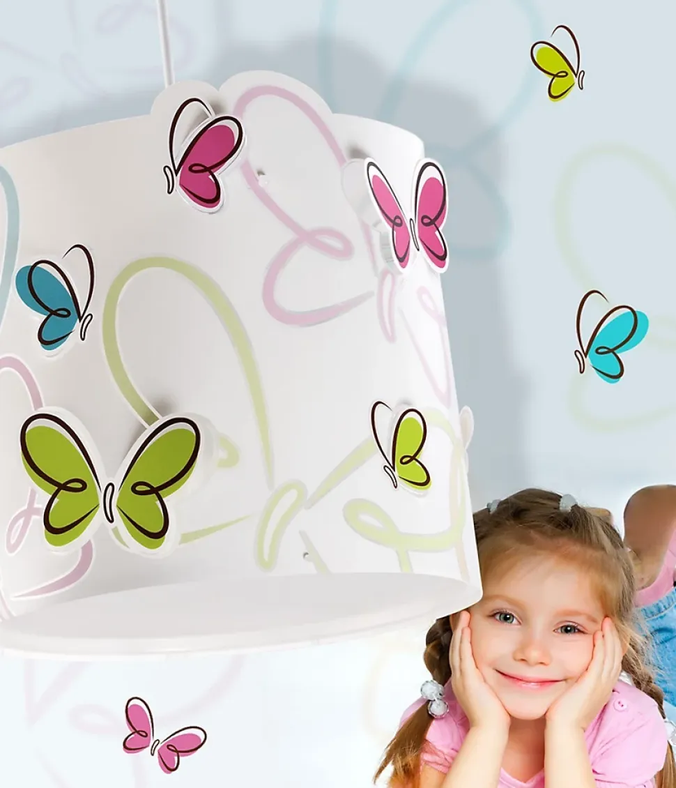 Lustre pour enfant avec papillon de la collection ButterfllyLe luminaire pour enfants Buttefly avec des papillons remplira de couleur la chambre des enfants : en polypropylène transparent, avec un abat-jour transparent et des motifs de papillons découpés, il est réglable en hauteur pour s’adapter parfaitement à la pièce. Ce lustre pour enfant avec papillon dispose d’un diffuseur de lumière inférieur amovible pour éviter l’éblouissement.