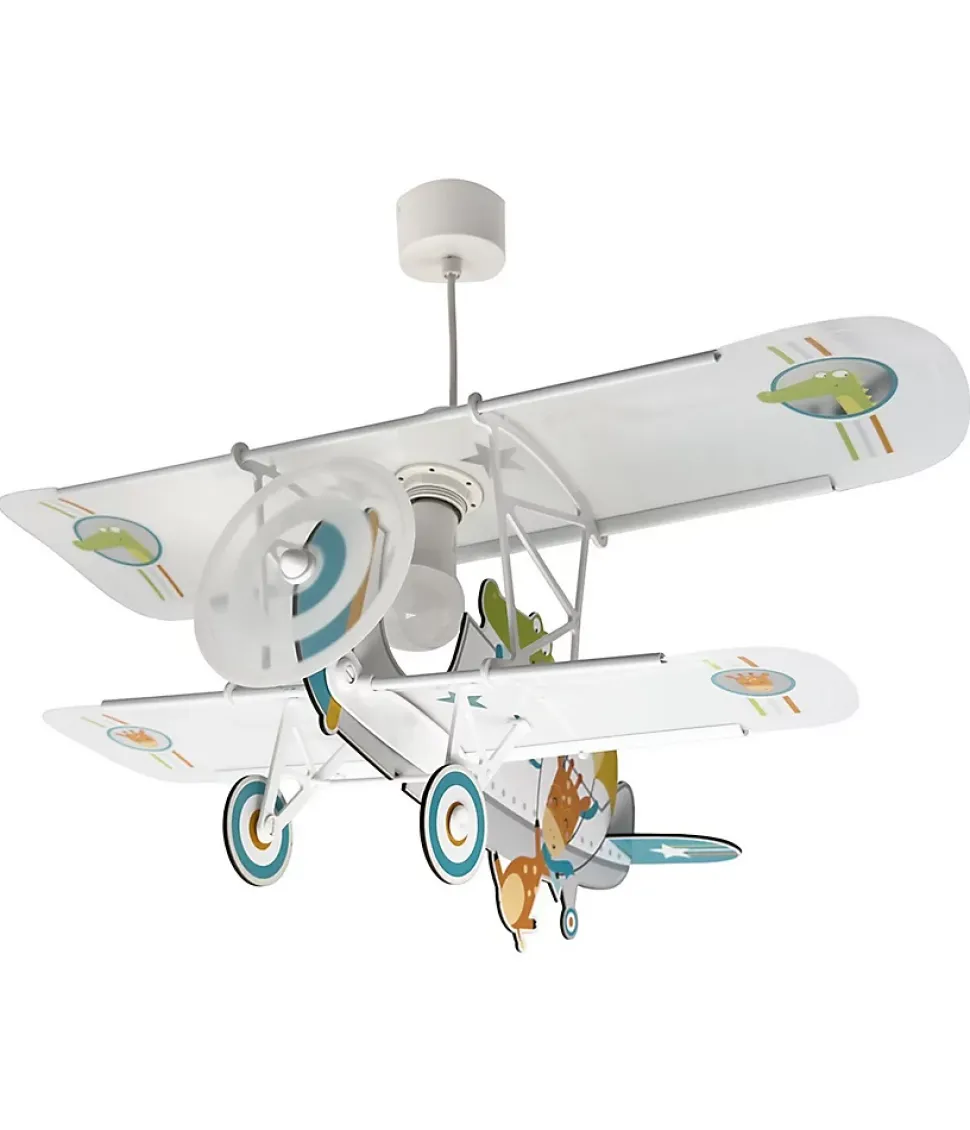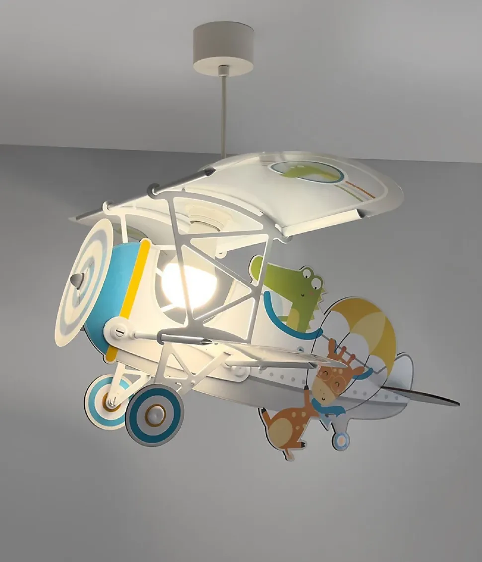 Lustre suspension pour enfant Petit Crocodile prêt à décoller de l’avion crocodile, structure en bois (MDF) avec abat-jour en propylène transparent, inclut la fluorescence (durée d’éclairage dans l’obscurité 10 à 15 minutes, la lumière doit être allumée depuis au au moins 5 minutes).