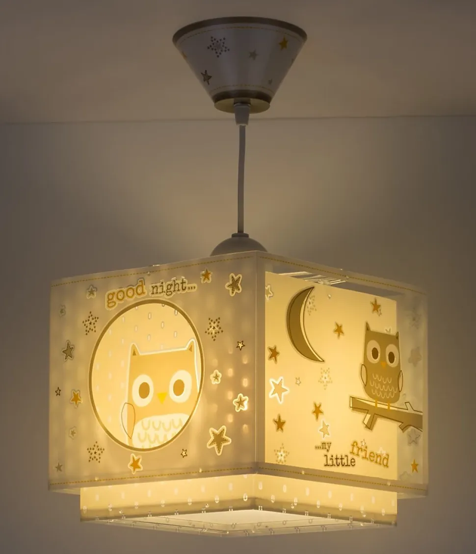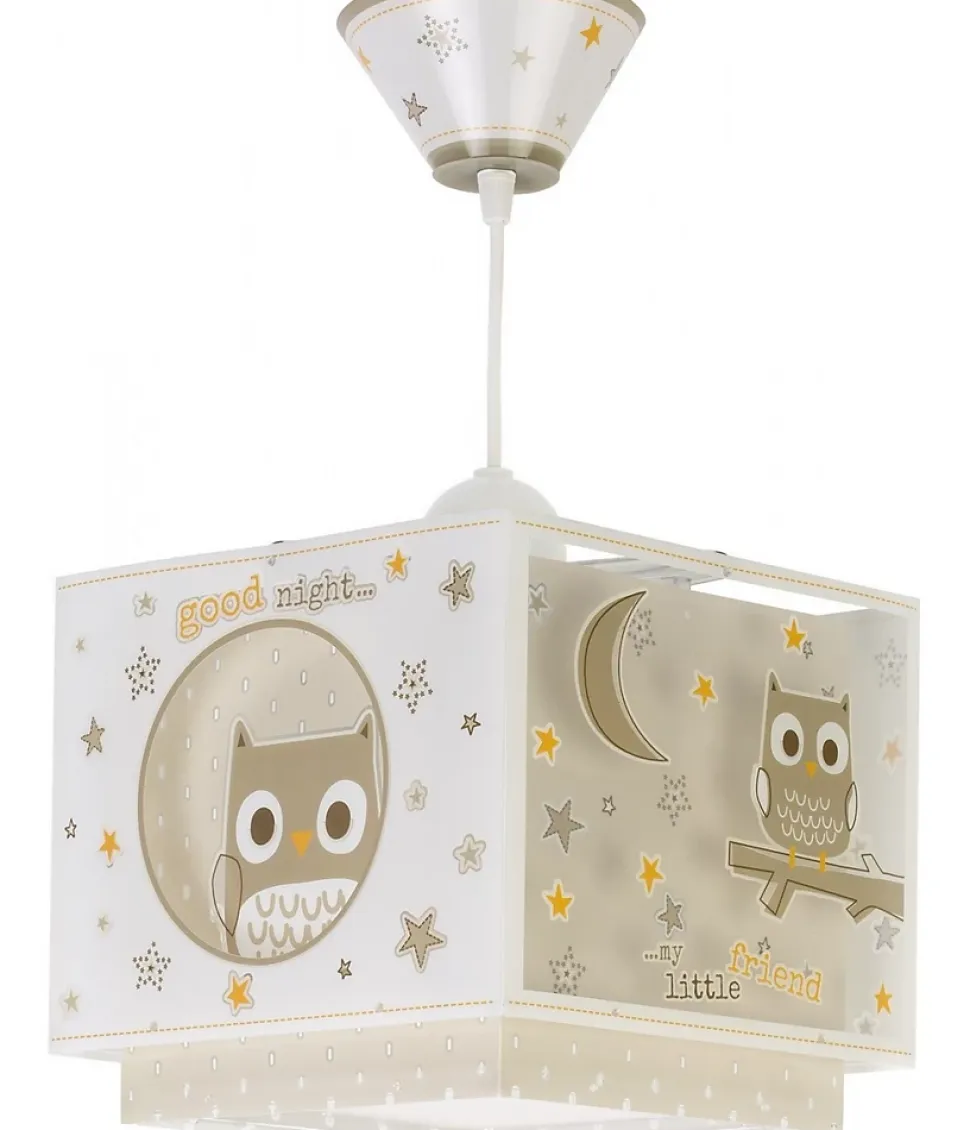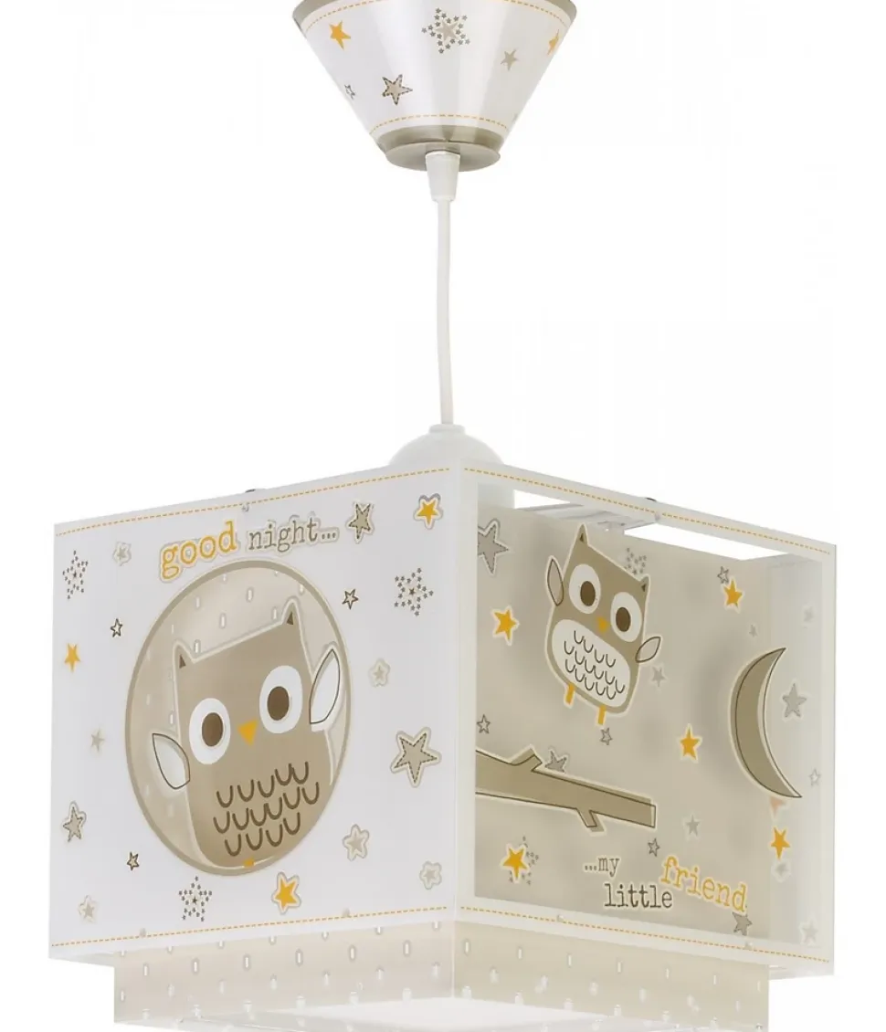 Suspension pour chambre de garçon Good NightIl s’agit de la suspension de chambre de garçon Good Night, qui avec une sympathique décoration chouette et étoile sera chargée d’apporter de la lumière et de la couleur au plafond de la chambre des enfants, générant un éclairage général parfait pour accompagnez-les pendant qu’ils jouent ou font leurs devoirs.Suspension luminaire d’enfant : caractéristiquesLe luminaire pour garçon Good Night, comme le reste de nos collections, est réglable en hauteur afin que vous puissiez l’adapter parfaitement à la hauteur du plafond de la pièce. Il a un double écran en polypropylène transparent, réalisant un effet décoratif unique, et un diffuseur de lumière inférieur pour éviter l’éblouissement. Il a également un effet de fluorescence : lorsque la lumière est éteinte, les personnages brilleront dans le noir pendant quelques minutes grâce à son effet fluorescent !