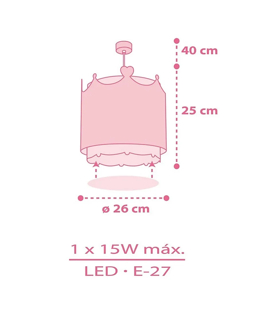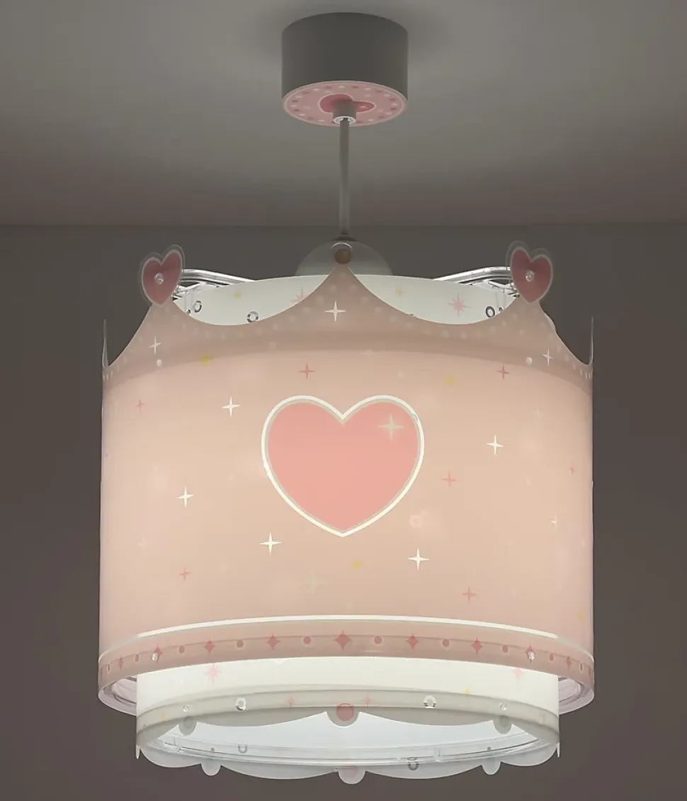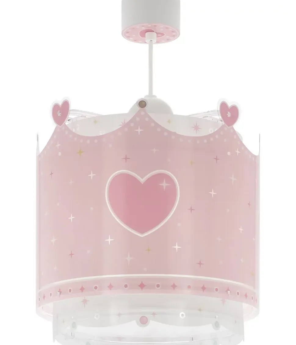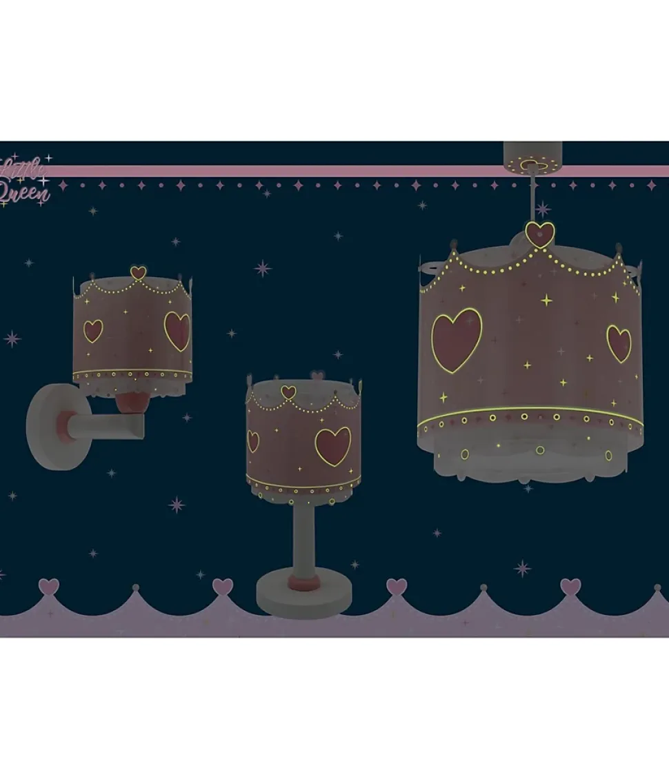 Acheter lustre pour chambre fille Little Queen Avec le lustre pour chambre fillee de la collection Little Queen vous mettrez toute la magie de son design dans la chambre d’enfant grâce à son double abat-jour en transparent polypropylène avec un coeur rose, un fond d’étoile et une forme de couronne. Il est réglable en hauteur pour s’adapter aux caractéristiques de la pièce et comprend un diffuseur de lumière inférieur amovible pour éviter l’éblouissementLustres pour filles avec fluorescenceLe lustre pour filles Little Queen brille dans l’occurrence !. Grâce à son effet de fluorescence, les contours des différentes figures brilleront dans le noir pendant quelques minutes lorsque la lumière est éteinte, lorsque la pièce est sombre. Les petits adorent !