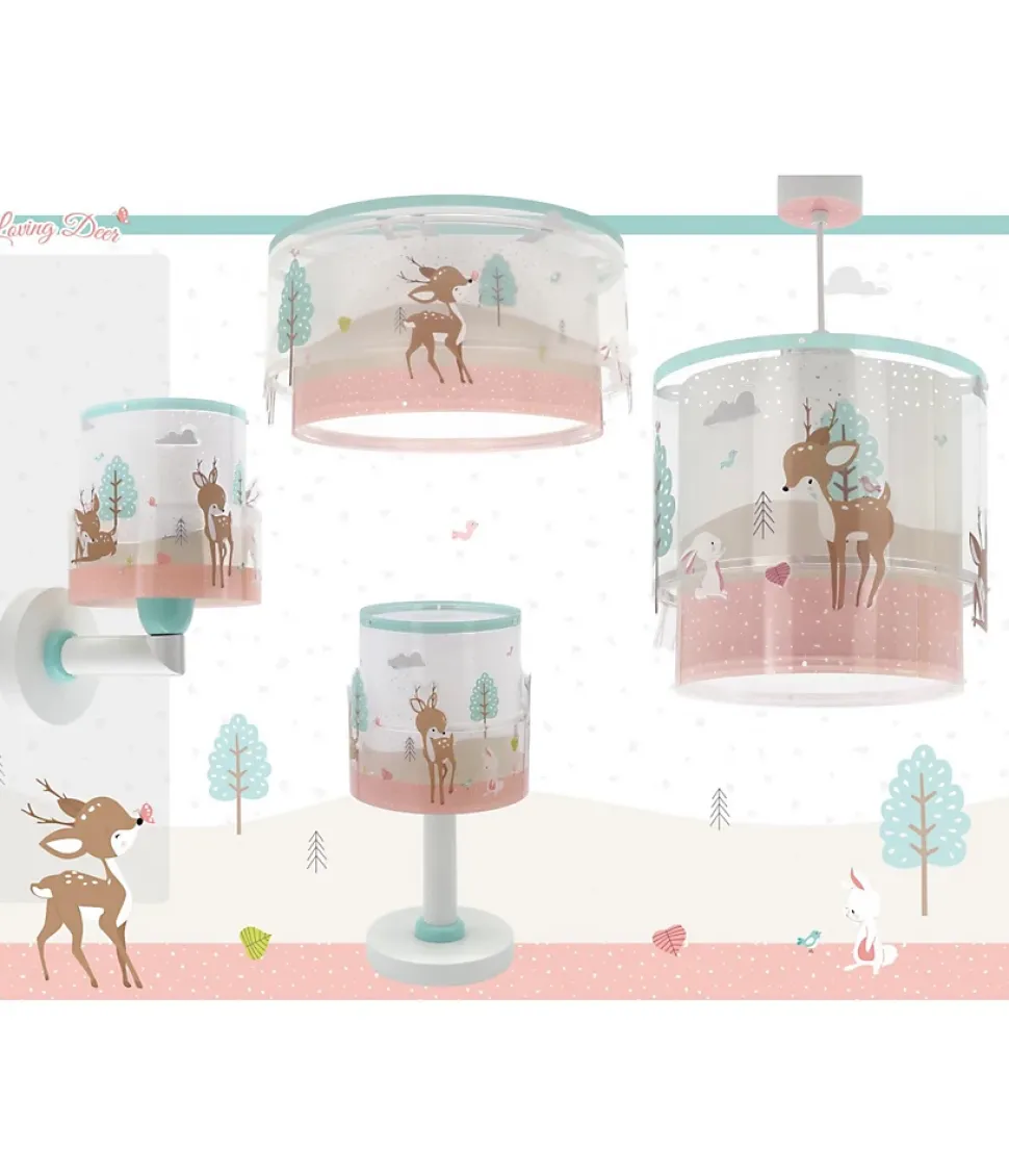 Acheter le luminaire pour enfant Loving DeerLe luminaire Loving Deer est l’une des nouveautés Dalber, et vous y trouverez une tendre scène de conte de fées avec une certaine sympathique et un lapin que les petits de la maison adoreront ! Le design du luminaire pour enfants présente le cerf dans différentes positions – debout, assis… – et ses drôles de compagnons de jeu : un lapin blanc et un petit oiseau. Les couleurs pastel de cette magnifique suspension bébé donneront à la pièce une atmosphère cosy et calmeCaractéristiques du luminaire pour enfant Loving DeerLe luminaire pour enfant Loving Deer sera votre grande alliée pour éclairer et décorer la chambre d’enfant. Nous passons en revue les caractéristiques que vous trouverez dans cette suspension :Le luminaire pour enfants Loving Deer est réglable en hauteur : vous pouvez donner à la lampe la hauteur dont vous avez besoin, vous serez ainsi totalement sûr qu’elle sera parfaite dans la pièceIl dispose d’un double écran en polypropylène transparent : les motifs décoratifs sont divisés en deux écrans différents qui se chevauchent, offrant un effet décoratif unique. Les petits adorent !Le luminaire Loving Deer dispose d’un diffuseur de lumière inférieur amovible, qui permettra aux enfants de recevoir une lumière douce sans éblouissement qui les éblouit