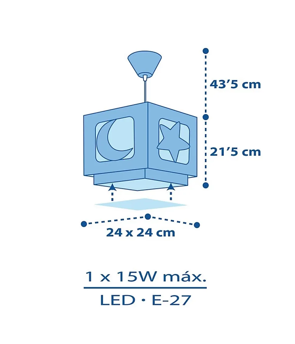 Lustre chambre bébé garçon Moonlight bleuLe luminaire de chambre d’enfant Moonlight est parfait pour donner une touche élégante à la chambre d’enfant : avec une décoration lune et étoiles et un double abat-jour transparent, c’est l’un des designs par excellence de nos collections.Luminaire de lune et étoiles pour enfantsLa lampe pour enfants Moonlight, en polypropylène transparent, a un effet de fluorescence, elle brille donc dans le noir et les petits l’adorent ! Il est également réglable en hauteur pour s’adapter parfaitement à la pièce et dispose d’un diffuseur de lumière inférieur amovible pour éviter l’éblouissement.
