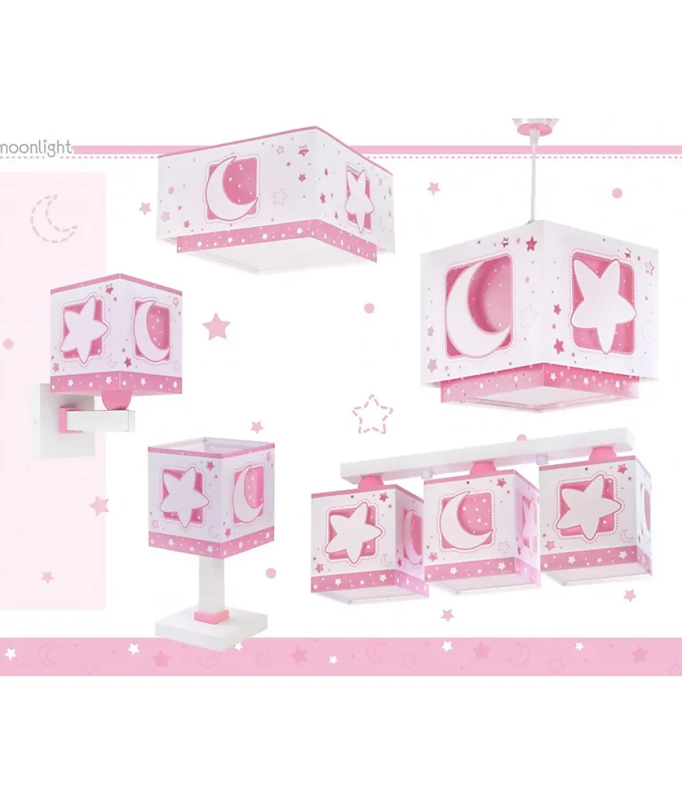 Lustre chambre bébé garçon Moonlight roseLe luminaire de chambre d’enfant Moonlight est parfait pour donner une touche élégante à la chambre d’enfant : avec une décoration lune et étoiles et un double abat-jour transparent, c’est l’un des designs par excellence de nos collections.Luminaire de lune et étoiles pour enfantsLa lampe pour enfants Moonlight, en polypropylène transparent, a un effet de fluorescence, elle brille donc dans le noir et les petits l’adorent ! Il est également réglable en hauteur pour s’adapter parfaitement à la pièce et dispose d’un diffuseur de lumière inférieur amovible pour éviter l’éblouissement.