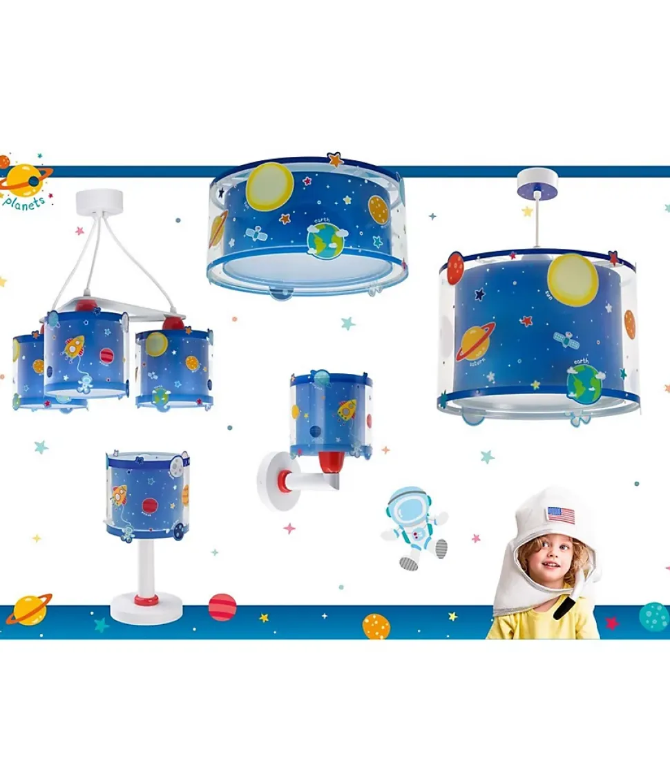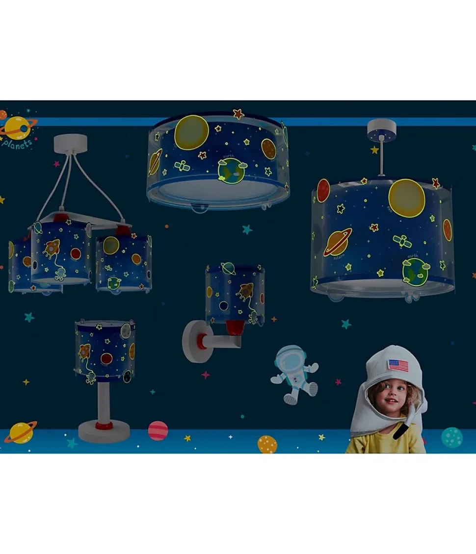 Suspension luminaire pour enfant PlanetsLa suspension luminaire pour enfant de la collection Planets fait entrer les planètes du système solaire dans la chambre des enfants. Réalisées en polypropylène transparent et dotées d’un double écran transparent, les planètes seront superposées sur le fond bleu, générant un effet décoratif unique. Le suspension est réglable en hauteur et comprend un diffuseur de lumière inférieur pour éviter l’éblouissement.Luminaire de chambre d’enfant phosphorescenteSi vous cherchez une luminaire qui attire l’attention des enfants, le luminaire pour enfants Planets vous propose, en plus de son design original, de briller dans le noir ! Cette lampe a un effet fluorescent : pendant le fonctionnement de la lampe, elle absorbe la lumière et lorsque la pièce est sombre, les plus petits pourront apprécier l’effet fluorescent, qui durera quelques minutes.