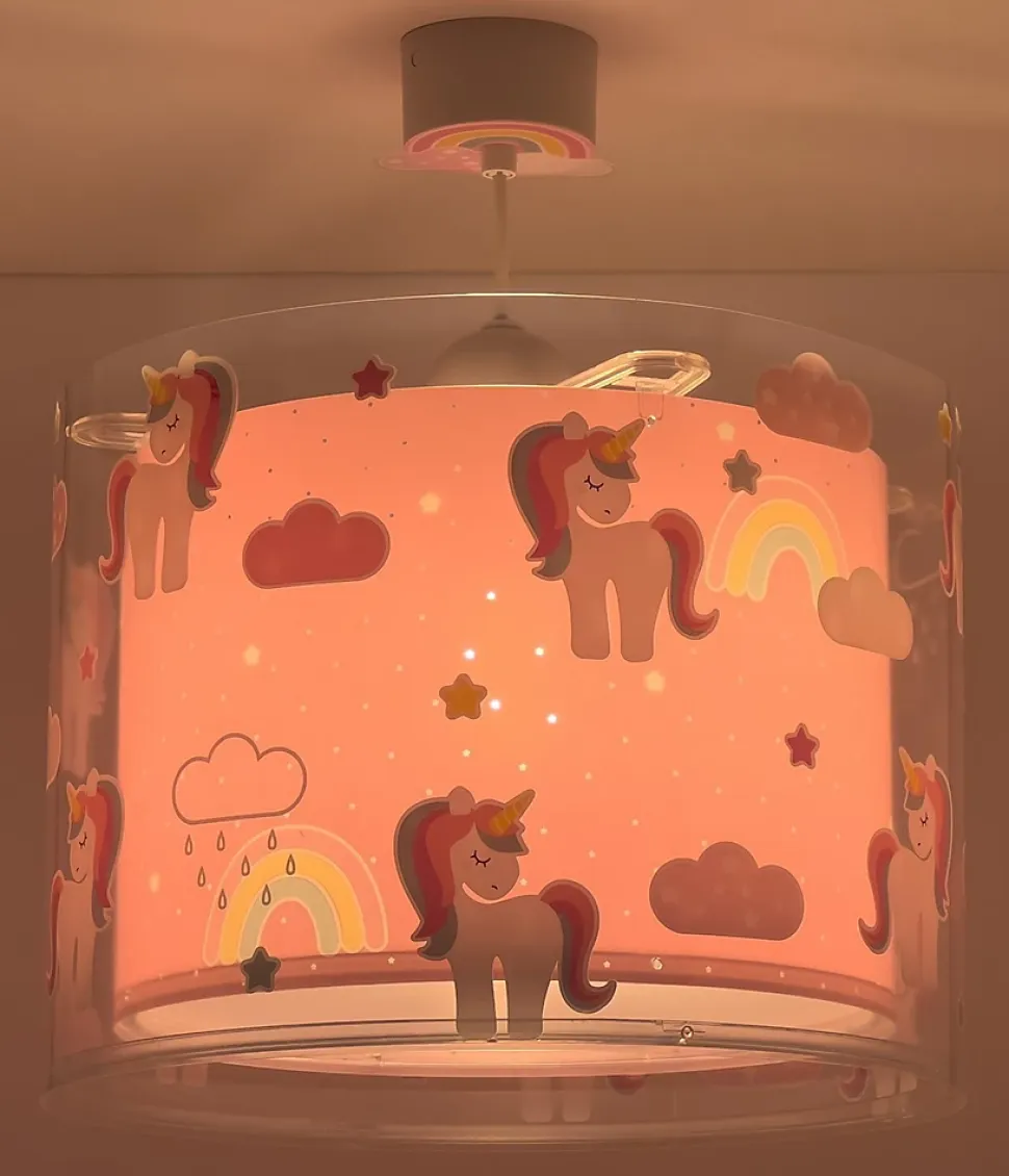 Plafonnier à imprimé licorne, composé d’un double abat-jour transparent rose, la lampe parfaite pour décorer et éclairer la pièce.
