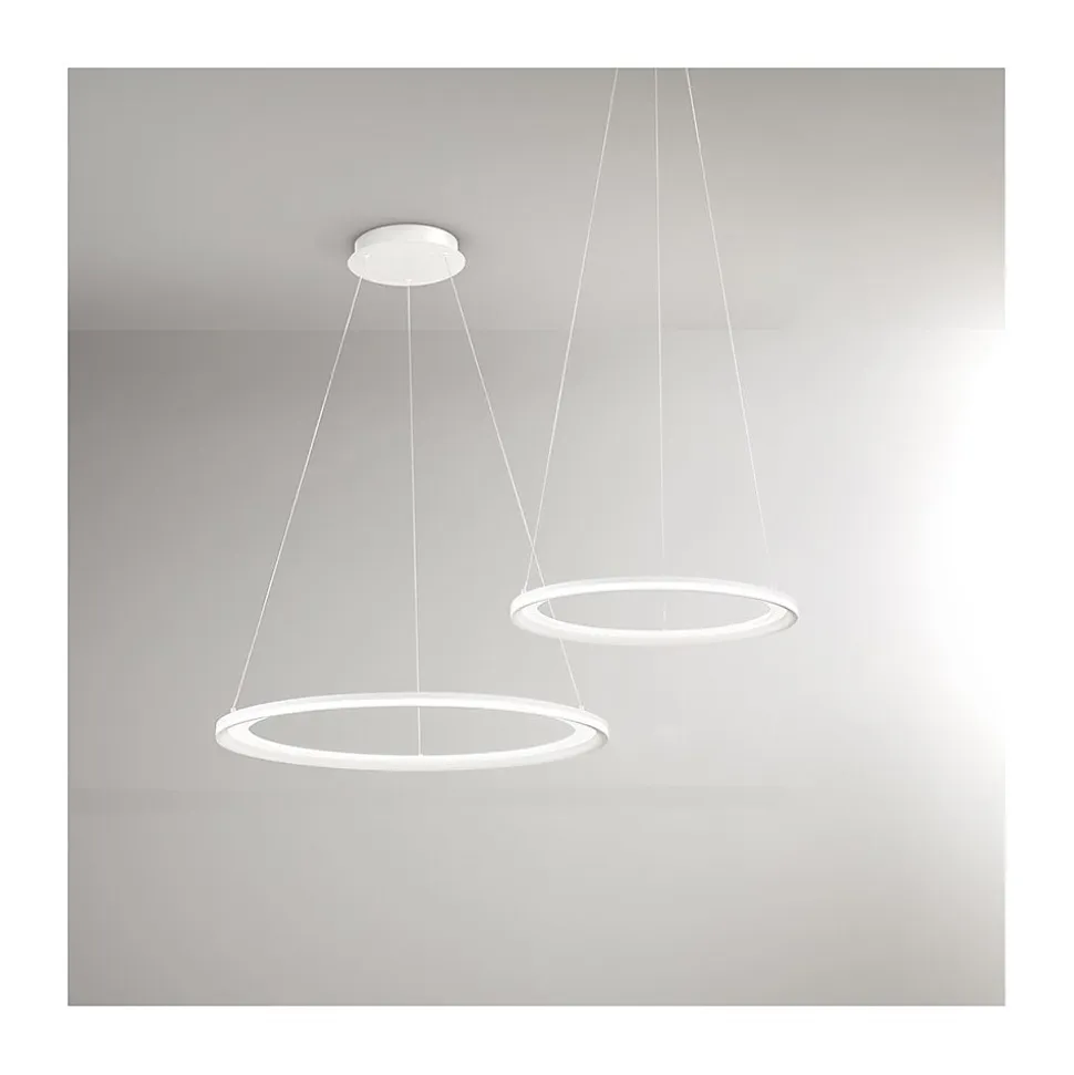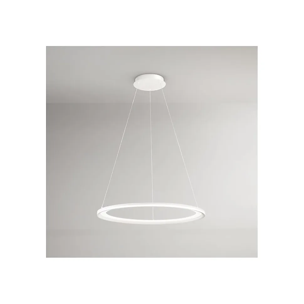 Lustre suspendu LED Edge moderne, rond et en métal blanc de 66 watts.Lustre LED à suspension design composé d’un anneau très lumineux.Dimensions : anneau ø80cm, hauteur réglable jusqu’à 150cm.Idéal pour une installation dans des maisons modernes dans des pièces telles que les salons, les cuisines, les chambres, les couloirs ou les salles de bains. Lustre LED au design moderne très apprécié des architectes d’intérieur, architectes et aménageurs, il est très lumineux. Lustre suspendu LED parfait pour décorer les studios professionnels, les bureaux, les magasins ou les salles d’exposition.La lampe blanche s’intègre dans tous les environnements. Ce lustre LED a un indice de protection IP20, il ne peut donc être utilisé qu’en intérieur. Matériau du corps d’éclairage en métal peint en blanc.Ce plafonnier LED est disponible uniquement dans la tonalité de couleur de lumière chaude (3000K).TYPE D’EMBRAYAGE :DIRECTRÉGIME:230 V CAPOUVOIR:86WattsCOULEUR DE LA LUMIÈRE :3000KFLUX LUMINEUX :6020 LumensTAILLE:P.80xH