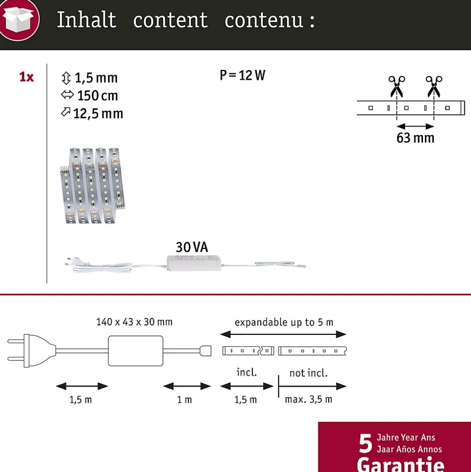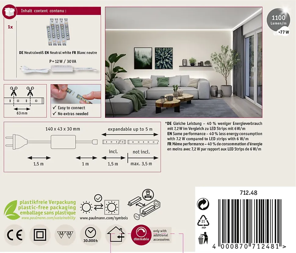 Kit complet avec Strip et alimentation|Strip LED à haute efficacité 40 % d’énergie en moins pour le même rendement lumineux|Température de couleur: 4000K – Blanc neutre|Peut être raccourci en fonction de la longueur souhaitée|Face arrière autocollante pour un montage simple|Gradable avec le contrôleur variateur/commutateur MaxLED|Aménagements personnalisés|Montage simple par système de connexion