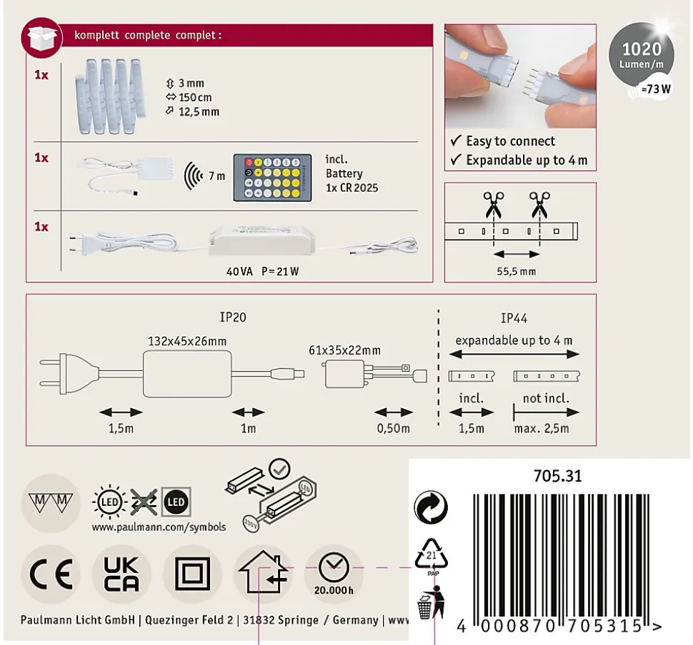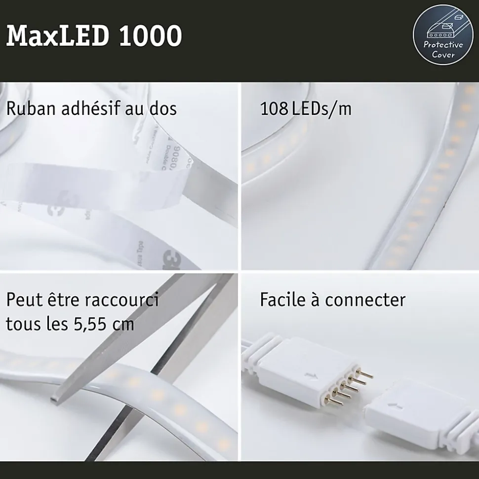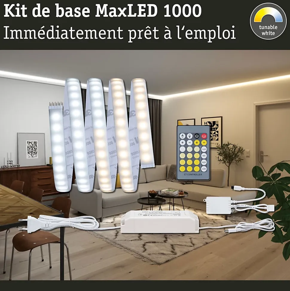 Le strip d’une longueur de 1,5 m offre une intensité lumineuse de ~ 1000lm/m et peut ainsi servir d’éclairage de base. Ils sont particulièrement impressionnants dans les profilés. Grâce à la commande de la lumière blanche intelligente Tunable White, vous pouvez personnaliser la température de couleur du strip d’un blanc lumière du jour en guise d’éclairage de travail à un blanc chaud plus propice à la relaxation. Outre le ruban, le kit de base contient une télécommande, un récepteur et un ballast. Il est possible, au besoin, d’étendre le système à l’aide de strips et de connecteurs supplémentaires. La longueur maximale indiquée ne doit pas être dépassée.