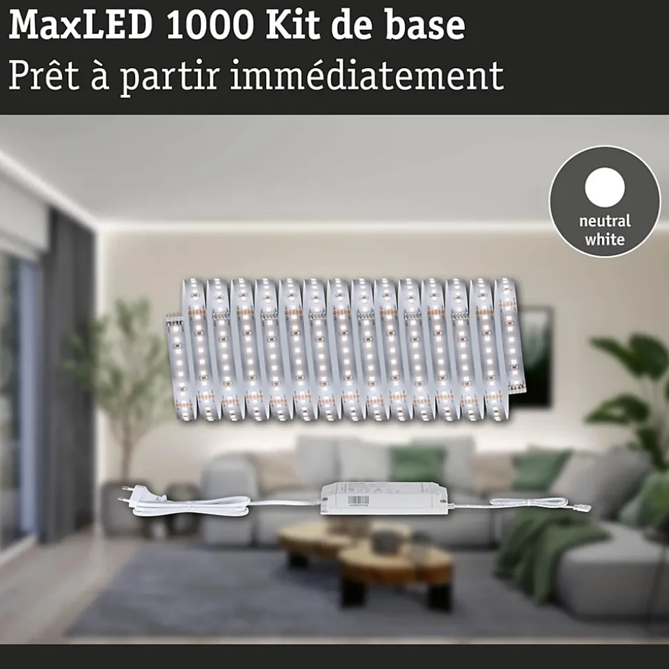Kit complet avec Strip et alimentation|Strip LED à haute efficacité 40 % d’énergie en moins pour le même rendement lumineux|Température de couleur: 4000K – Blanc neutre|Peut être raccourci en fonction de la longueur souhaitée|Face arrière autocollante pour un montage simple|Gradable avec le contrôleur variateur/commutateur MaxLED|Aménagements personnalisés|Montage simple par système de connexion