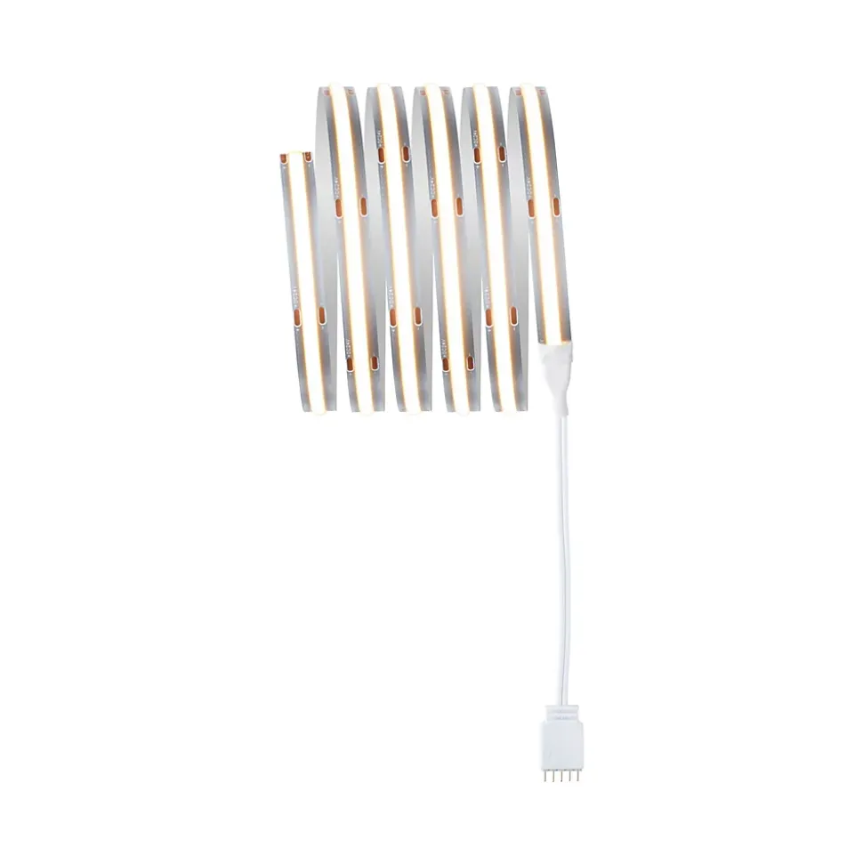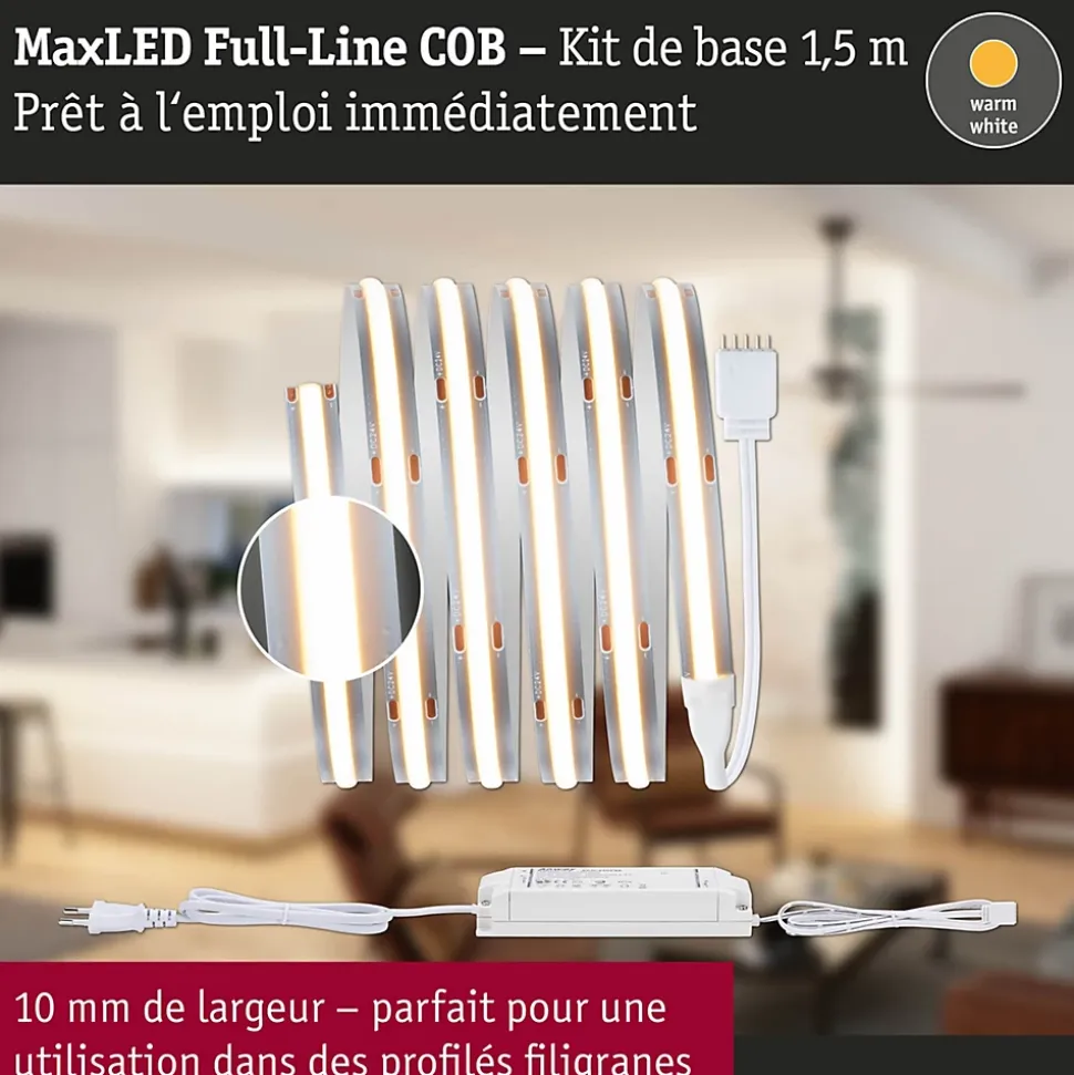 Les strips MaxLED 1000 Full-Line COB sont si puissants qu’ils peuvent être utilisés sans problème comme éclairage d’intérieur. Le kit de base MaxLED 1000 COB avec 528 LED/m produit un rayonnement absolument homogène sans points lumineux visibles. Le connecteur lumineux permet une connexion parfaite qui prolonge le visuel lumineux linéaire sans interruption visible. Le Strip de 10 mm est particulièrement étroit et se glisse donc facilement dans les profilés LED filigranes. L’angle de rayonnement large de 180° répartit la lumière à merveille sans ombre portée. Une couche continue de phosphore protège les LED de la poussière et de l’humidité, les points de contact ont l’IP20. La prolongation du kit de base blanc chaud est facile à l’aide d’un strip individuel adapté.
