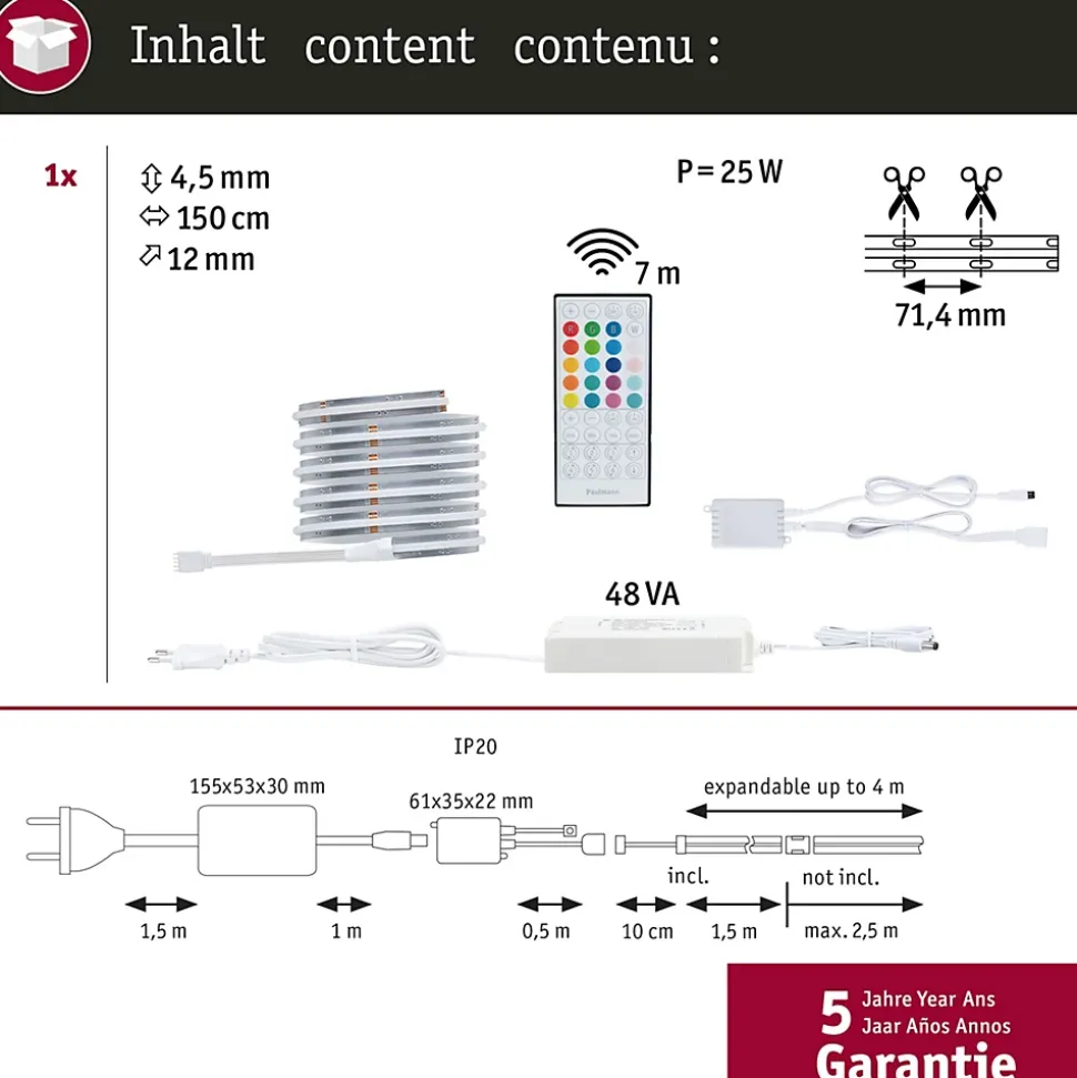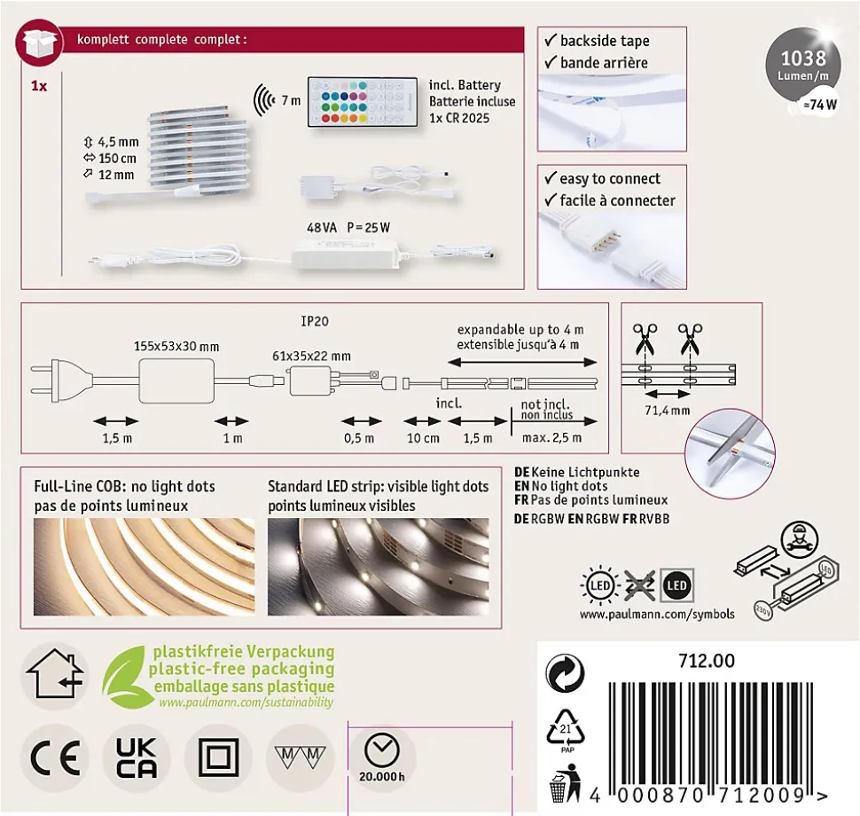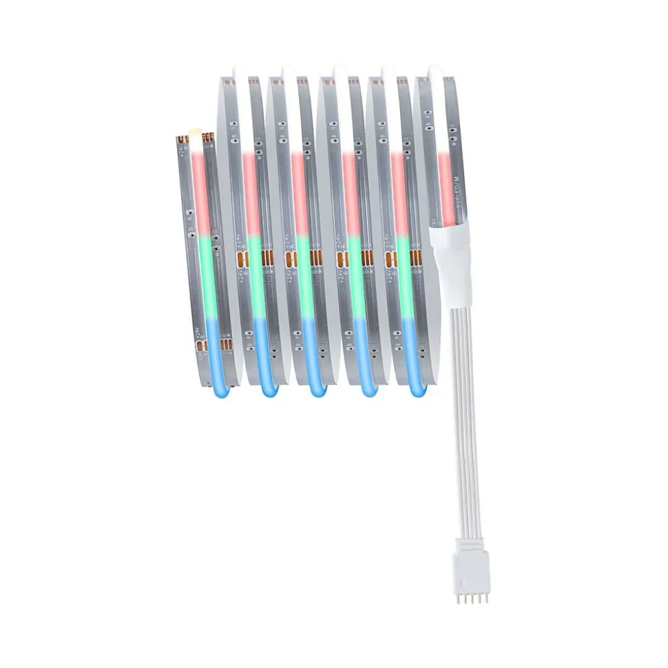RGBW offre une sélection fluide de teintes ainsi qu’une fonction supplémentaire Tunable-White|Kit complet avec ruban et alimentation|Peut être raccourci en fonction de la longueur souhaitée|Beschichtung schützt vor Spritzwasser und Staub|Einfaches Stecksystem zur problemlosen Montage|Face arrière autocollante pour un montage simple|Matériau flexible pour montage sur des surfaces planes ou à relief