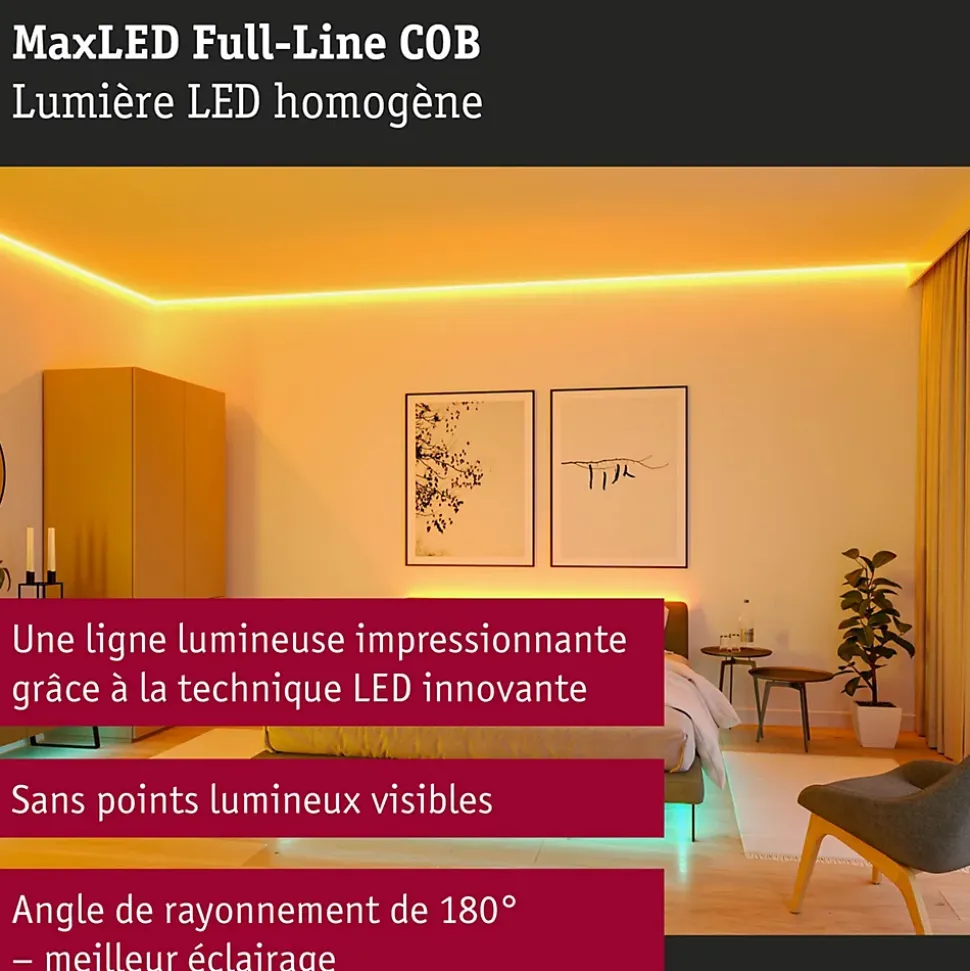 Le kit de base MaxLED 1000 full-line COB offre tous les composants nécessaires pour un éclairage impressionnant. Il comprend une bande lumineuse d’une longueur de 1,5m ainsi qu’un ballast adapté. Le kit de base peut être complété selon les besoins par des strips LED supplémentaires, des connecteurs et des unités de commande avec télécommande. Lors de la planification, il faut veiller à ne pas dépasser la longueur maximale indiquée. La technologie RGBW permet de choisir des teintes fluides et d’utiliser la fonction Tunable White. C’est ainsi que l’on crée l’ambiance adéquate, qu’elle soit relaxante avec un blanc chaud ou animée avec des couleurs vives.