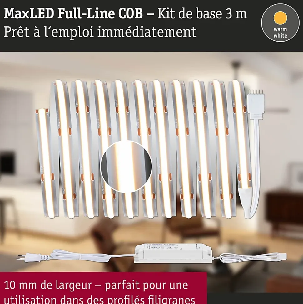 Les strips MaxLED 1000 Full-Line COB sont si puissants qu’ils peuvent être utilisés sans problème comme éclairage d’intérieur. Le kit de base MaxLED 1000 COB avec 528 LED/m produit un rayonnement absolument homogène sans points lumineux visibles. Le connecteur lumineux permet une connexion parfaite qui prolonge le visuel lumineux linéaire sans interruption visible. Le Strip de 10 mm est particulièrement étroit et se glisse donc facilement dans les profilés LED filigranes. L’angle de rayonnement large de 180° répartit la lumière à merveille sans ombre portée. Une couche continue de phosphore protège les LED de la poussière et de l’humidité, les points de contact ont l’IP20. La prolongation du kit de base blanc chaud est facile à l’aide d’un strip individuel adapté.