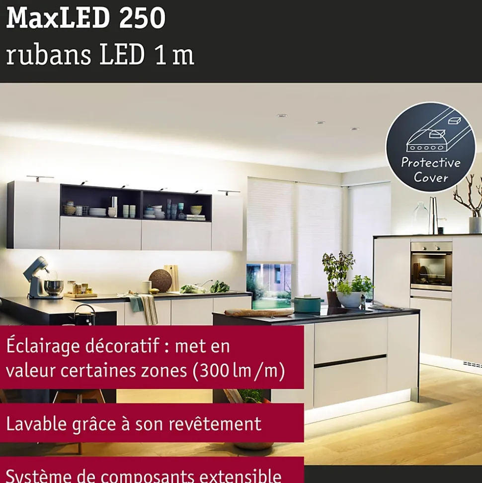 Ce Strip MaxLED 250 d’une longueur de 1m est pourvu du gainage IP44 nouvelle génération « Protecting Cover », ce qui en fait l’équipement idéal pour les pièces humides. Il est le complément parfait du kit de base. Avec 4 watts, les Strips MaxLED sont si puissants qu’ils peuvent être utilisés sans problème comme éclairage d’intérieur. Ils sont particulièrement impressionnants dans les profilés. Les strips blanc chaud délivrent un éclairage d’ambiance et fonctionnel agréable et relaxant.